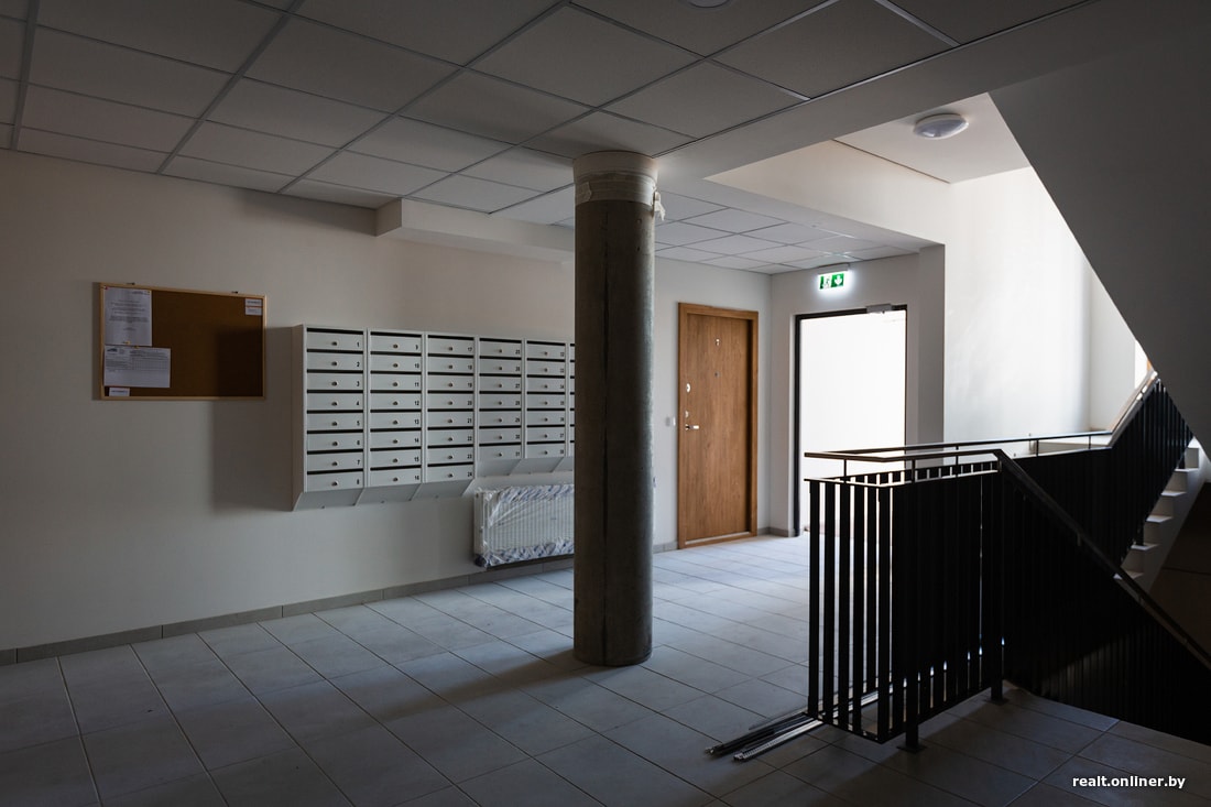 Дверь в подъезд прозрачная и находится на уровне земли. Никаких ступенек и пандусов — оказывается, так строить тоже возможно. Лифт расположен на одном уровне с дверью подъезда, а шахта не имеет общих стен с квартирами. Лестничные пролеты освещены солнечным светом за счет огромных окон. Инсоляции здесь уделяют особое внимание: того требуют жесткие нормы по энергосбережению.