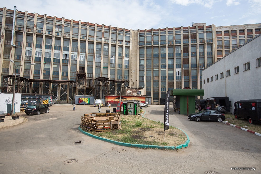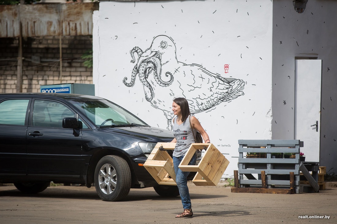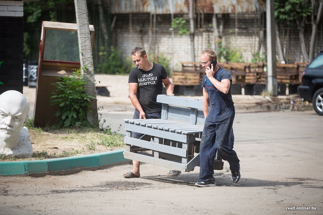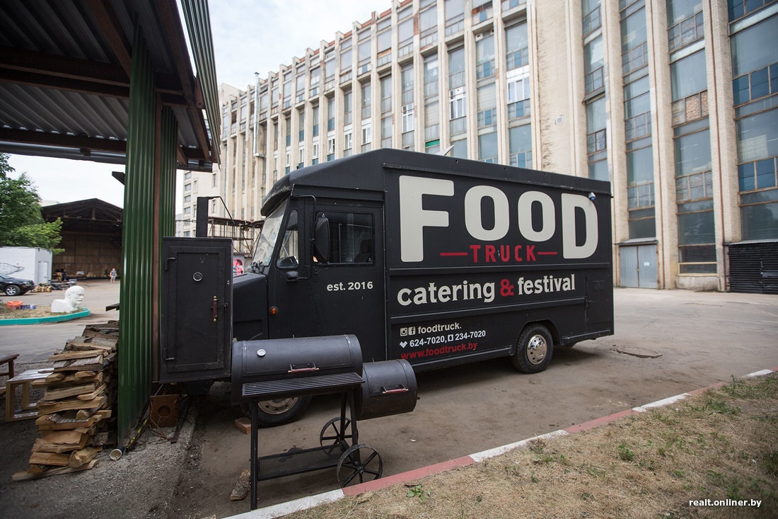 Фуд-корт расположился на углу улиц Машерова и Куйбышева, прямо за «гастродвориком». Сейчас здесь идут последние приготовления к открытию: хрупкие девушки спешно переносят ящики, мужчины «колдуют» над своими передвижными кафе, кто-то с тряпочкой орудует над бюстом Ленина, видимо, найденным на заводе, художник дорисовывает картину на стене.