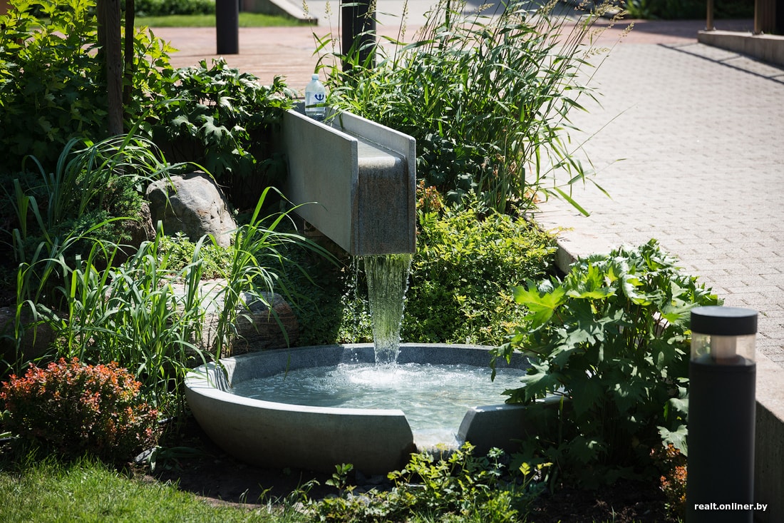 Квартал рассчитан на 200 семей, его особенностью станет система из 15 фонтанов и утопающий в зелени двор. Если минские застройщики ограничиваются чахлыми кустиками, здесь прямо под окнами создается, как нам показалось, что-то вроде филиала ботанического сада.