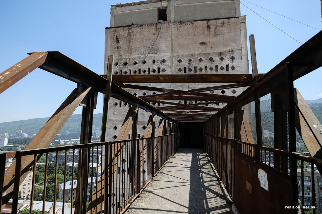Переходы-мосты и виды с них впечатляют и вполне стоят потраченных на подъем туристических копеек. Впечатляют и вдохновляют не только нас. Российский рэпер Хаски сделал основным местом действия своего недавнего клипа «Иуда» именно комплекс на улице Нуцубидзе. К сожалению, современное состояние комплекса, где в тоннеле, пронзающем средний корпус, устроен даже небольшой рынок, вполне соответствует депрессивной эстетике творчества этого исполнителя.