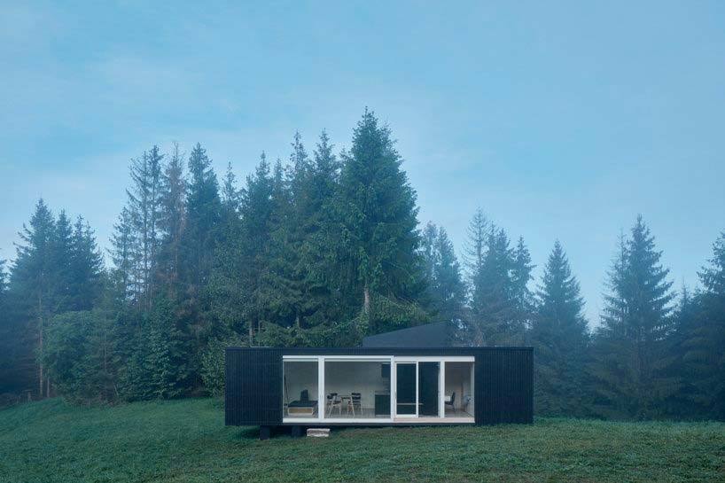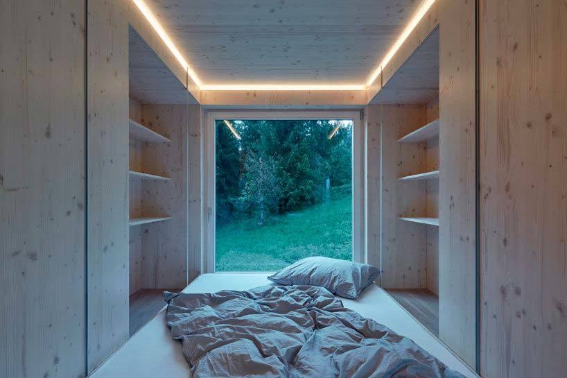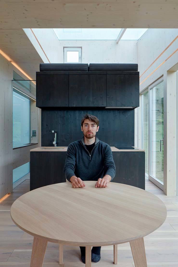 Небольшой дом без комнат, жилая площадь которого составляет 40 кв. м, изрезан окнами с четырех сторон и даже сверху. Это обеспечивает полное погружение в естественное окружение и создает уникальную атмосферу.
