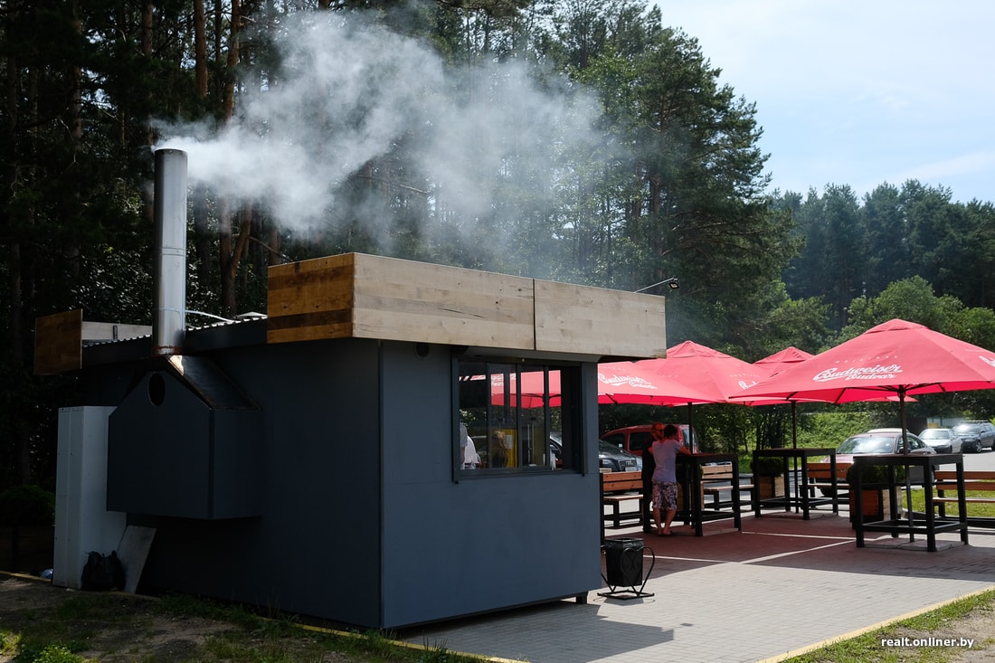 Адрес у точки такой: если ехать по привычной дороге на Минское море, которая начинается после проспекта Победителей, нужно до моста повернуть направо, к пляжу. Тут из трубы поднимается серый дым: работает печь-гриль с самым настоящим огнем, который румянит мясо. Котлеты поворачивает мужчина восточной наружности, а молодые люди белорусской внешности принимают и раздают заказы.
