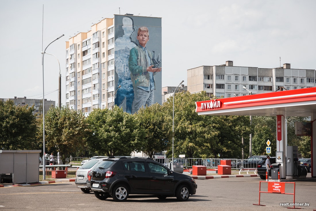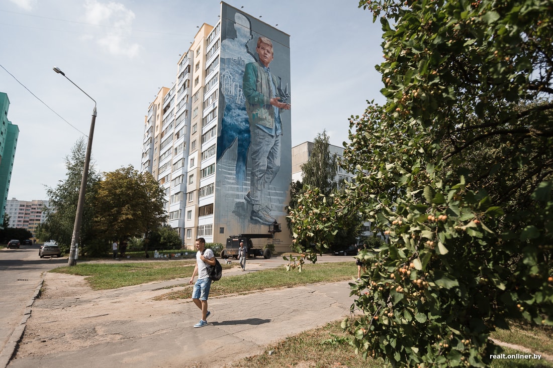 Мальчик, изображенный на доме, — реальный человек, маленький минчанин. «Мы нашли реального человека, подходящего по фактуре, сделали его снимки, Финтан создал эскиз. Он все свои мысли старается пропускать через образы простых людей. Потом сюда добавился монументальный советский арт, некоторые детали, которые преобразовались в готовую концепцию, — объяснял нам организатор проекта Urban Myths Олег Ларичев.