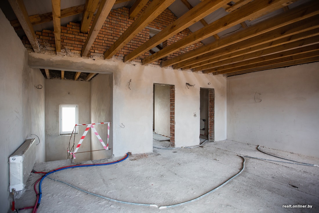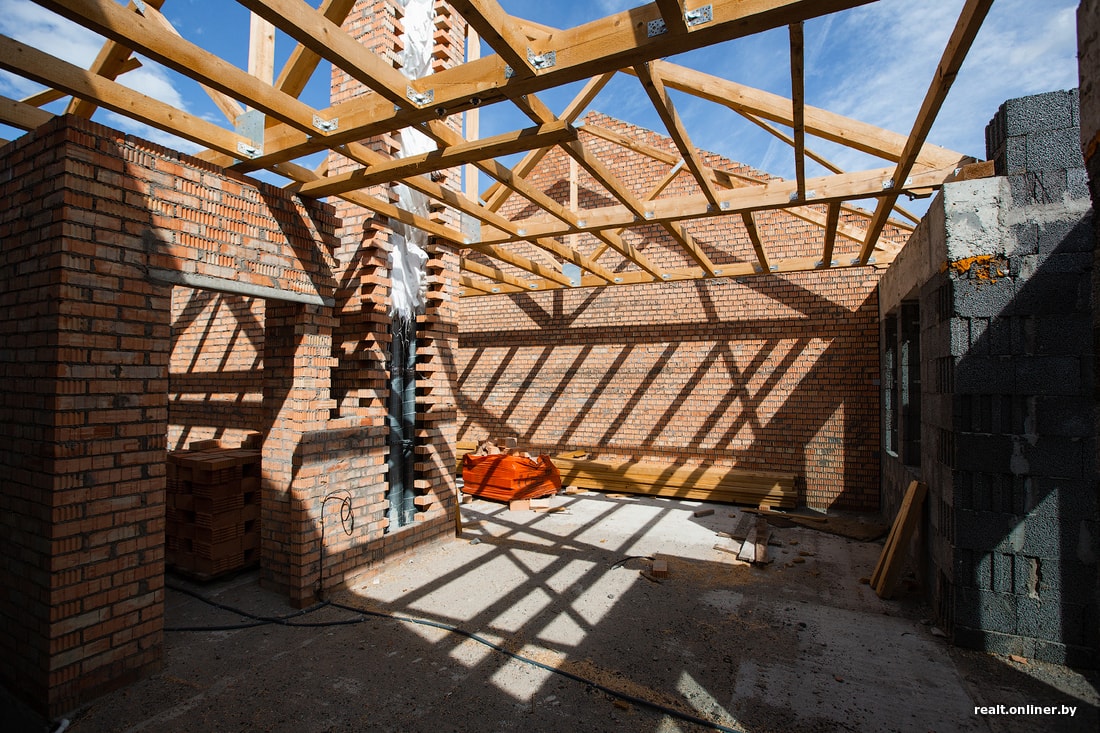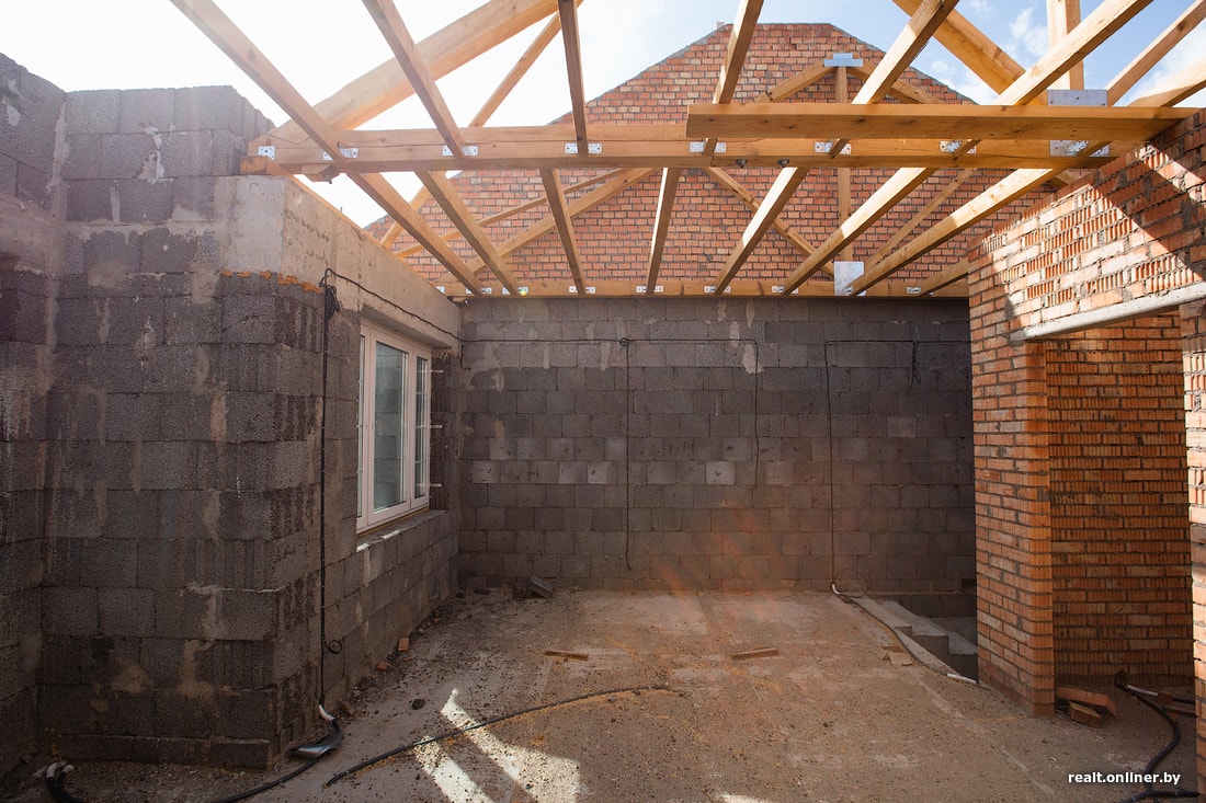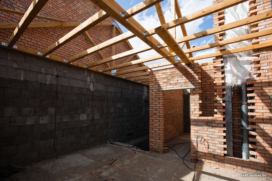 Нам показывают дом площадью 124,5 кв. м — это минимальный метраж из оставшихся вариантов. Коробка здесь уже готова, крыша смонтирована — остается вставить окна и выполнить черновую отделку. После заключения договора застройщик доведет дом до полной готовности за четыре месяца, еще несколько месяцев займет оформление документов.