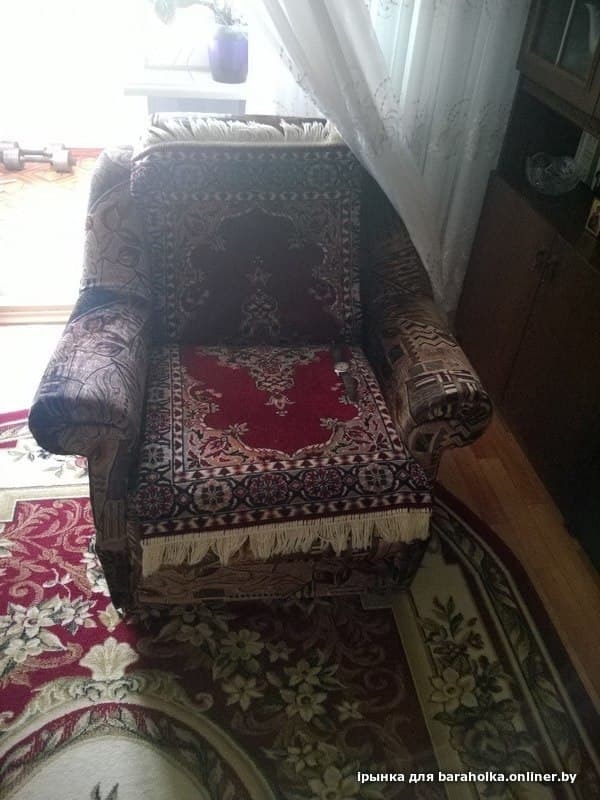 Мягкий угол «Журавинка» made in USSR продают за 250 рублей. В комплект входят два кресла и раскладной диван. «Механизм в диване рабочий и надежный, как кирпич. Советское качество, сейчас такого не производят. Отличный вариант для любого интерьера, — считает продавец, правда, в следующем же предложении сам себе стреляет в пятку. — Продается по причине смены интерьера и функционального назначения комнаты».