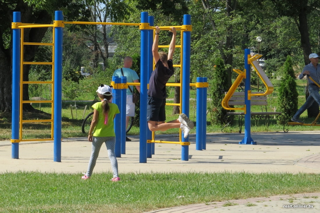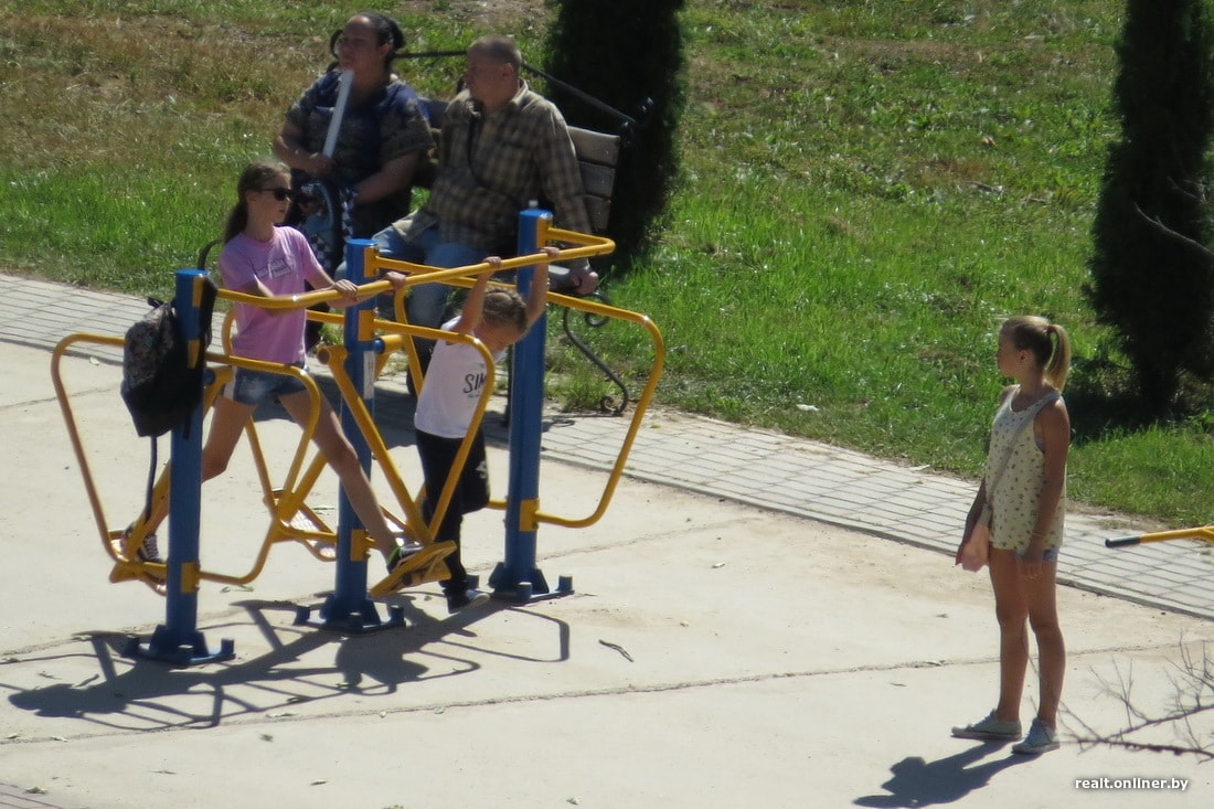 По территории гуляют люди, дети обживают игровые комплексы, физкультурники разбираются с новенькими тренажерами.