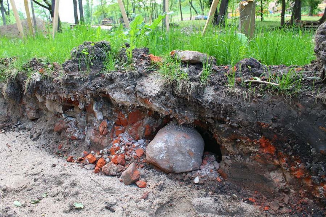— Вот торчит кладка XVI или XVII века… Вот печная керамика, похоже, XVII век… Вот кованый гвоздь… Вот кирпич-пальчатка, ему лет 400… — перечисляет Леонид. — Вообще-то, это малая часть того, что было. В 2015-м, когда началось строительство, по всему склону на бульдозерах гоняли… Остальную территорию техника утюжила — срезали, выравнивали, завозили грунт.