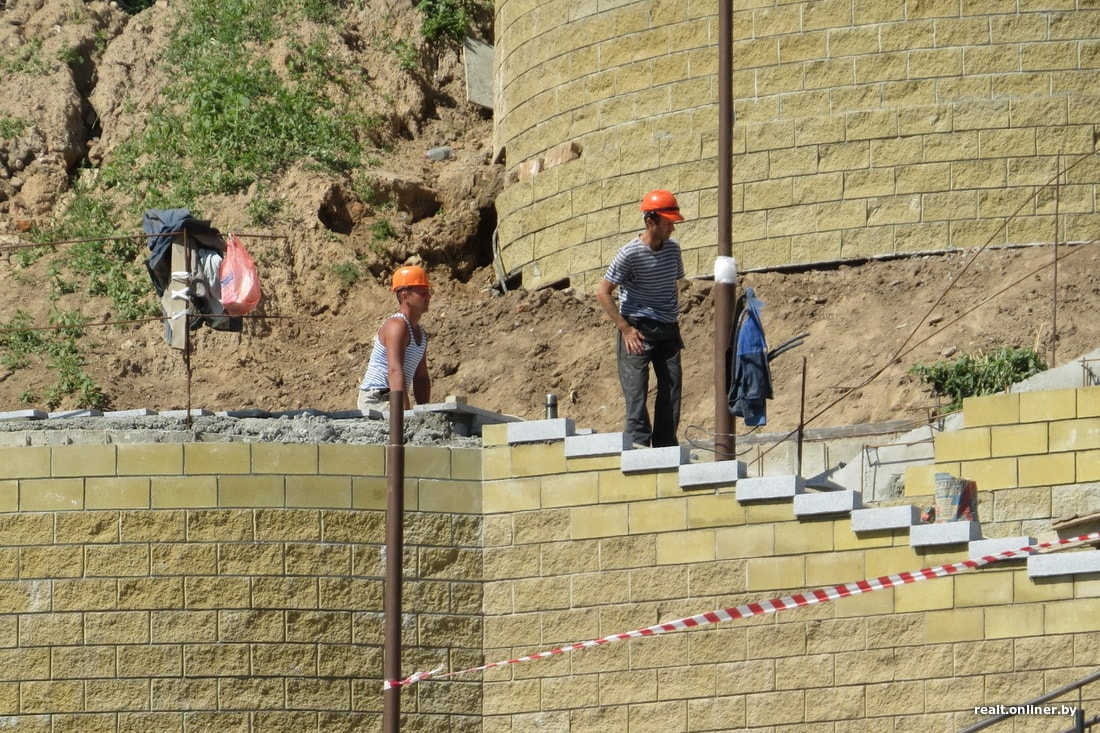Лестница — жемчужина комплекса. Она сейчас напоминает муравейник, ее спешат доделать. Простые формы — это слишком банально. В данном случае душа авторов требовала уступов и богатств. И чтобы текла вода (по проекту она должна скатываться сверху и бить из фонтанов внизу). Про безвкусицу и функциональность никто вовремя не рассказал, а теперь отступать поздно, сроки поджимают.