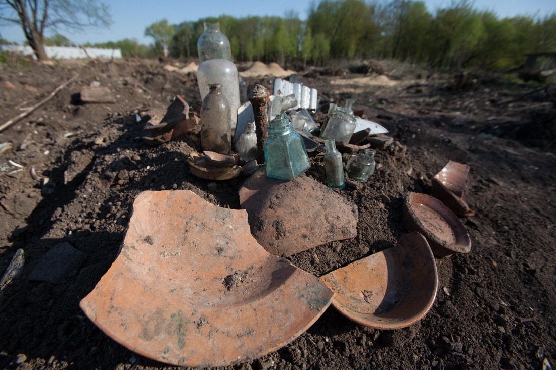 — Еще до начала всего этого строительства черные копатели перекапывали эту местность как картошку. Потом, когда началась стройка, я занес целую сумку в музей — стеклянные изделия, изразцы… Надо иметь в виду, что тут культурные слои разных веков. Например, находили, электрические плафоны с царским гербом.