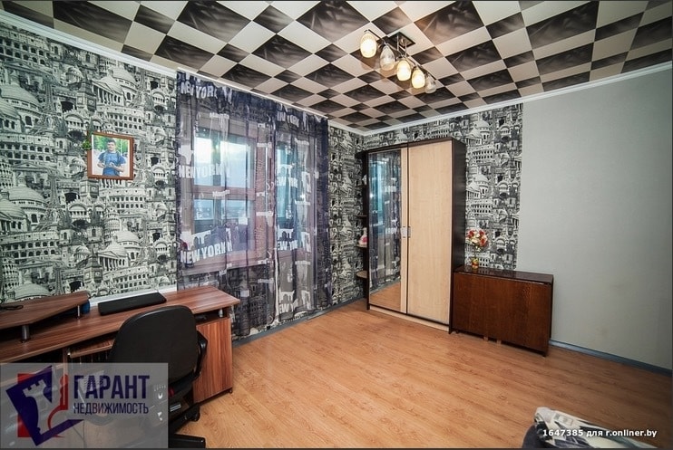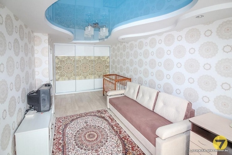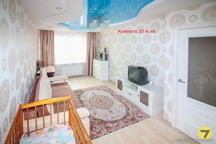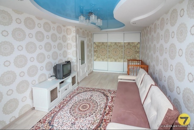 Потолок в другой комнате напоминает шахматную доску — от сочетания с обоями рябит в глазах. Но это опять же дело вкуса и личного восприятия. Продают «двушку» площадью 53,5 «квадрата» за $70 700 по курсу.