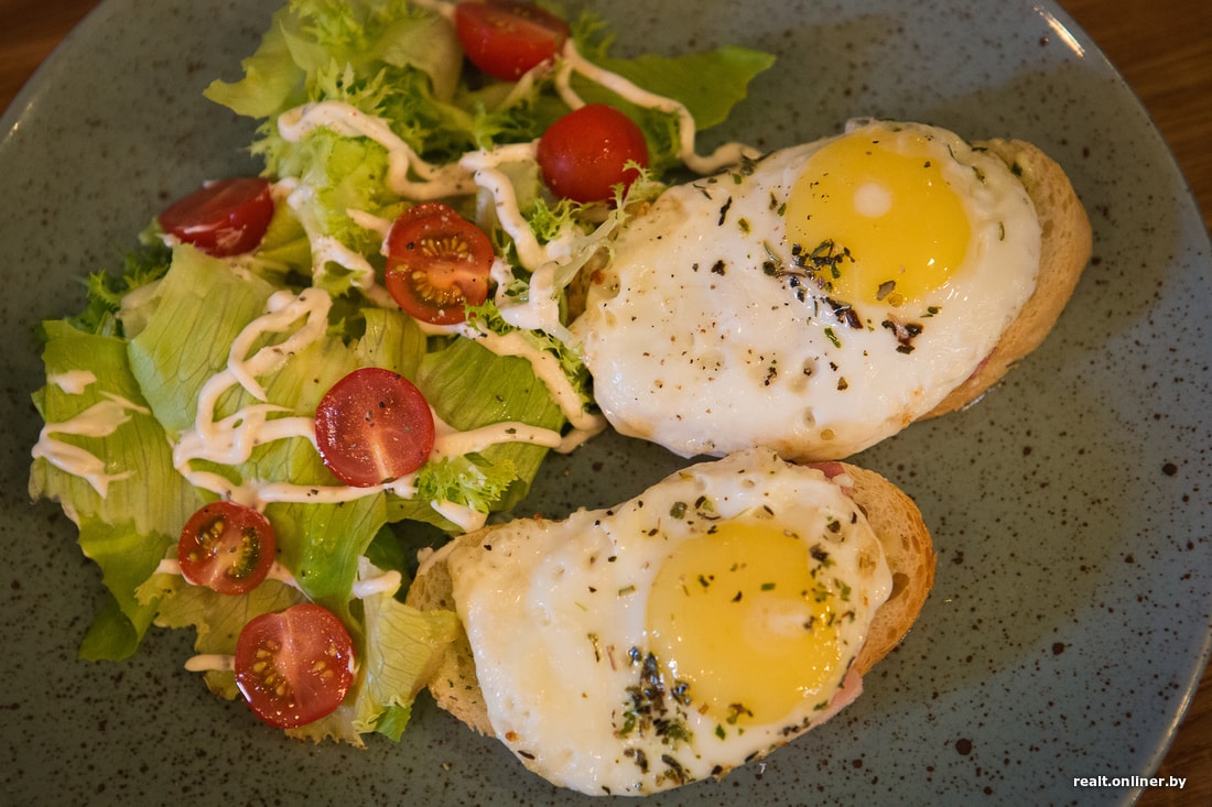 — Советую брускетты «Пейзан» — это два кусочка хлеба с поджаренным беконом, яйцом и салатом. Самое питательное блюдо в меню.
