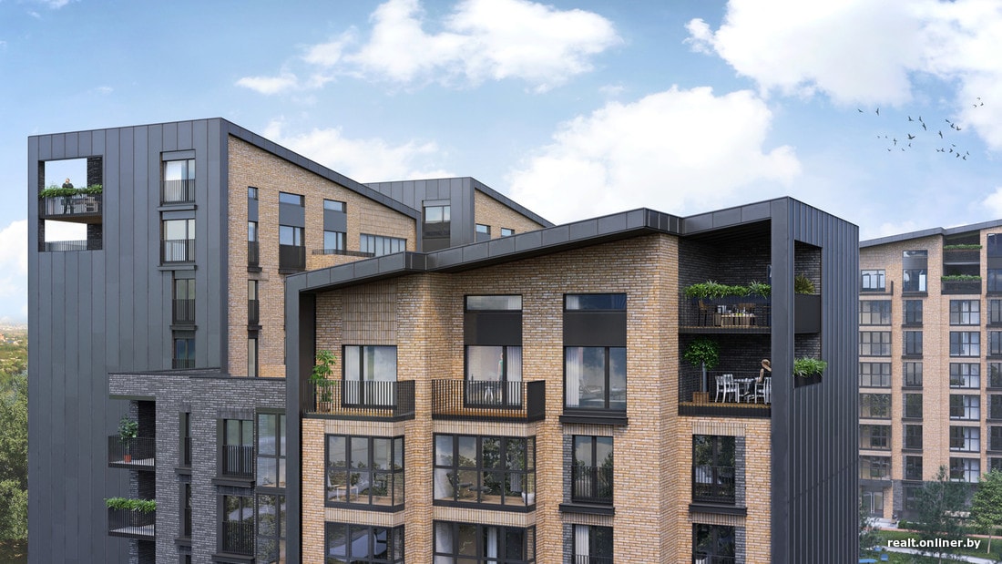 «Квартал-парк» будет состоять из семи домов: два монолитных и пять панельных. Правда, благодаря большим окнам в пол и особой отделке фасада панельные многоэтажки вовсе не похожи на образцы типового индустриального домостроения. Индивидуальности добавляют и надстроенные верхние этажи, благодаря которым дома обзаводятся скатными кровлями и мансардными двухуровневыми квартирами.