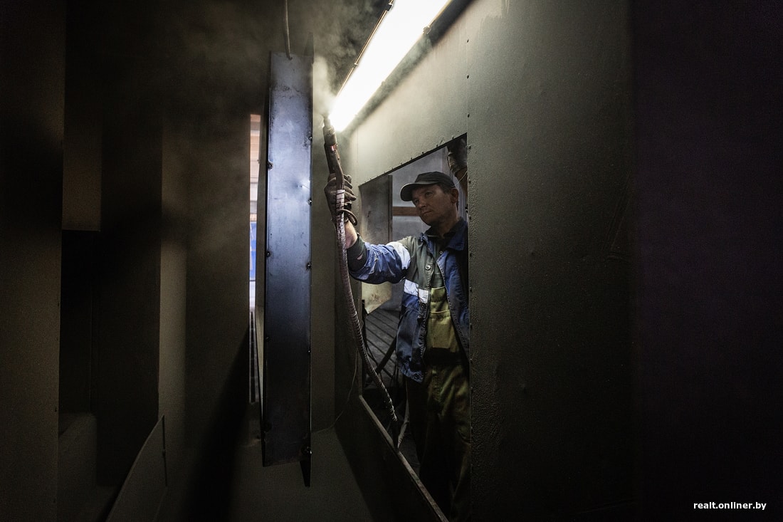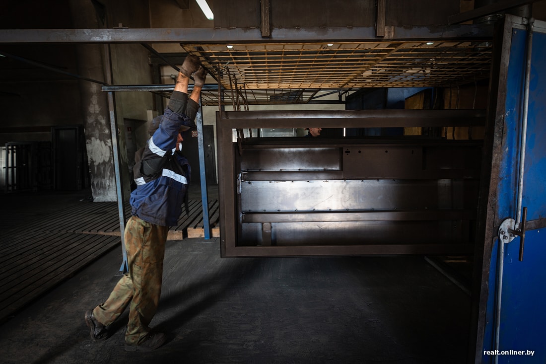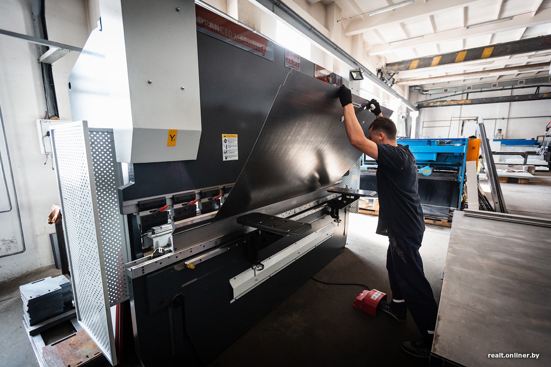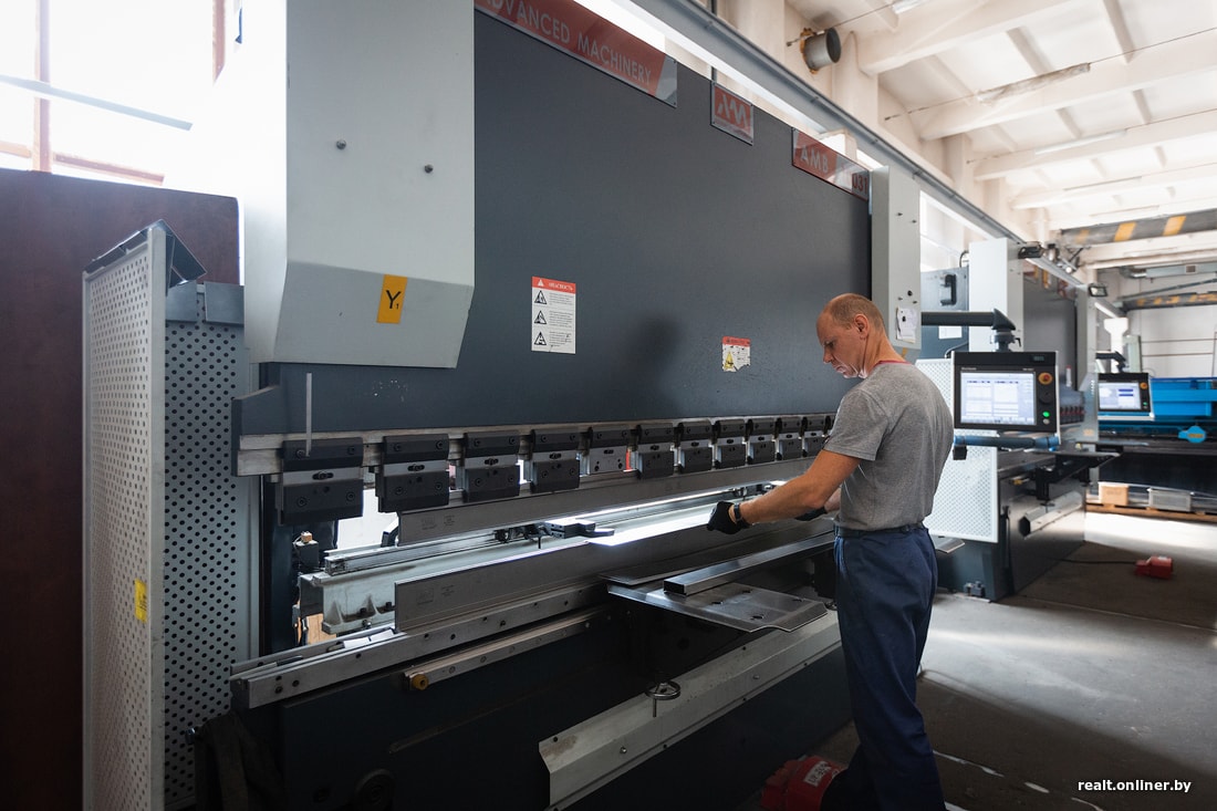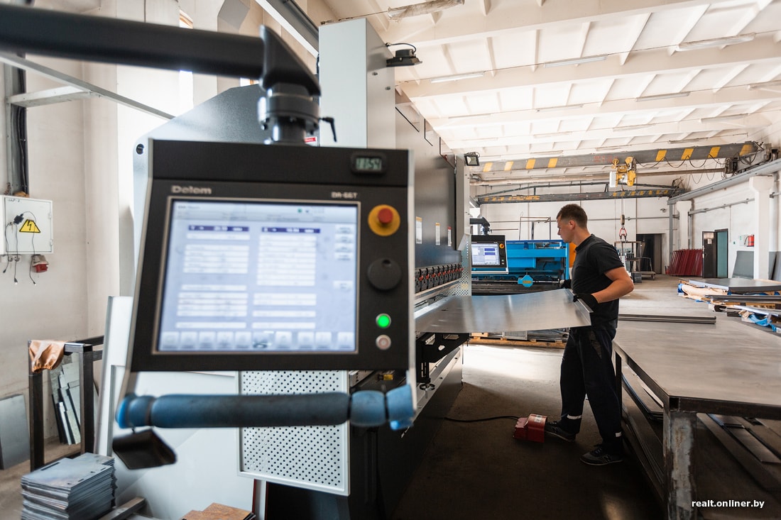 После шумного первого станка заготовка попадает на листогибочный пресс. За считаные секунды прочное металлическое полотно, кажущееся недеформируемым, обретает новые формы и очертания: сила механизмов — большая вещь. Понаблюдав за работой сотрудников, можно стать свидетелем того, как плоский блестящий лист превращается в будущую коробку и полотно. «Полуфабрикат» двери начинает свой путь.