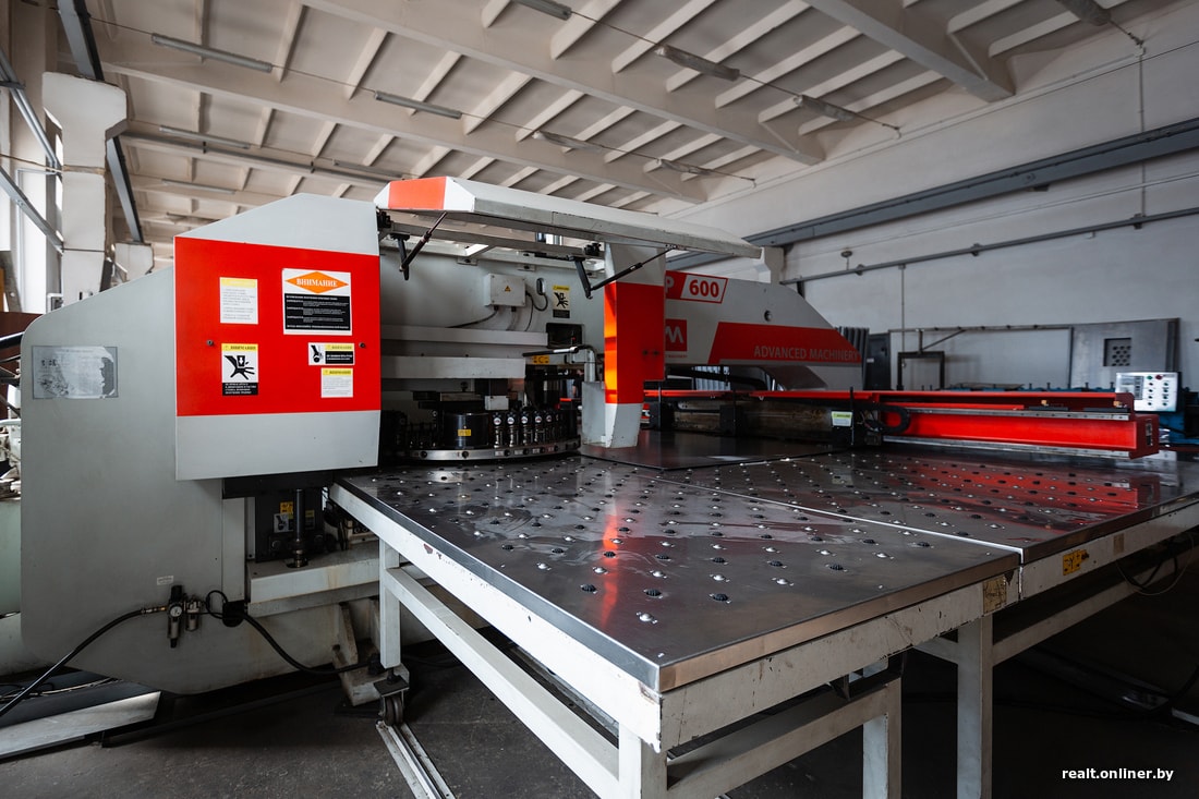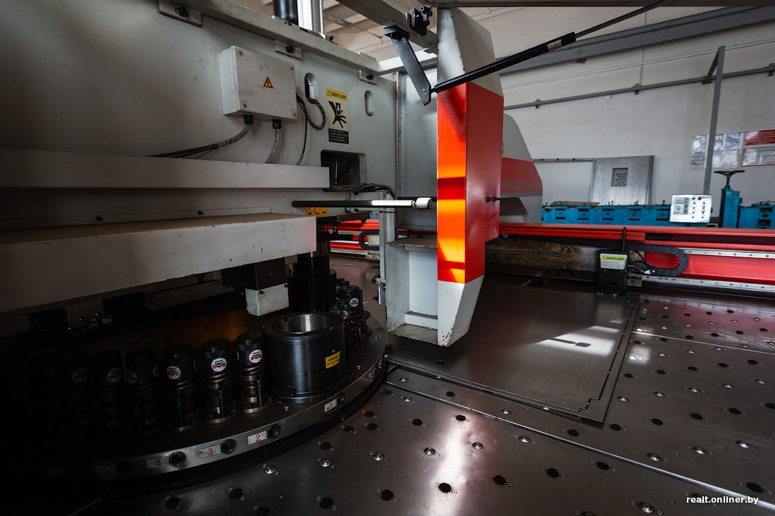 Сначала безликий металл, который в будущем может стать как неприметной дверью в подвал, так и воротами в дорогую усадьбу, попадает на координатно-пробивной пресс, где, согласно заданным программой координатам, пробивает полотно, коробку и остальные элементы, из которых состоит дверь. Работа над одним листом занимает до 5 минут и проходит отнюдь не беззвучно: если находиться в цеху целый день, без берушей не обойтись.