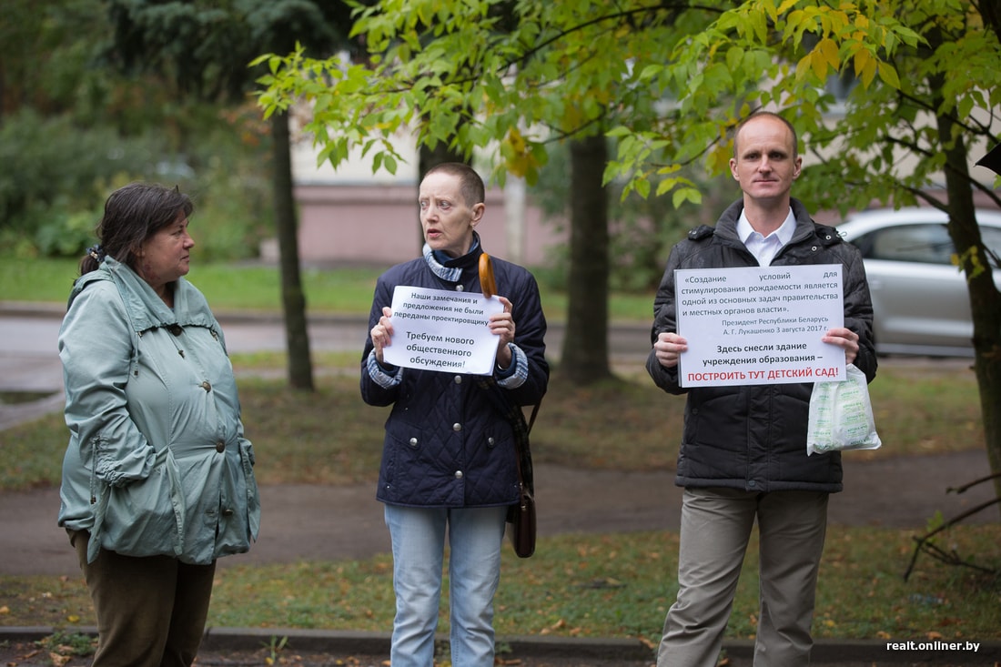 Акция получилось не массовая. Неожиданно накрывшая столицу осень поливала нескольких участников пикета дождем, но они стоически отбыли указанное в одобренной городскими властями заявке время, демонстрируя транспаранты с требованиями вернуть озеленение хотя бы частично, а также уменьшить размеры участка строящегося объекта одиноким прохожим.