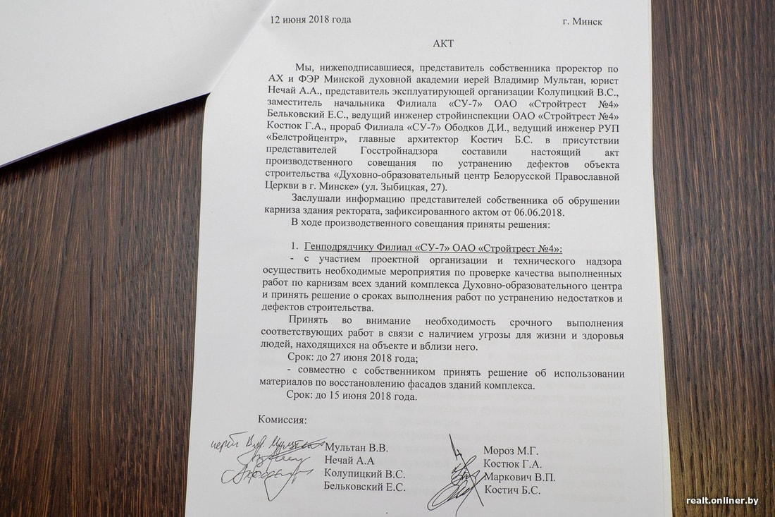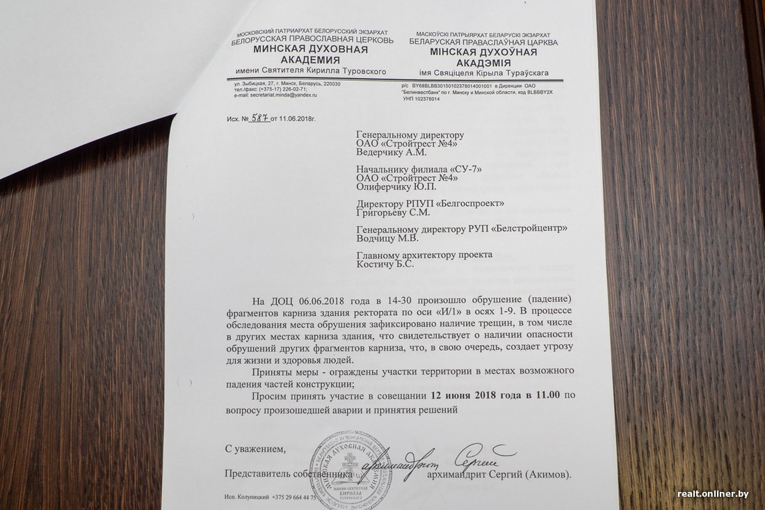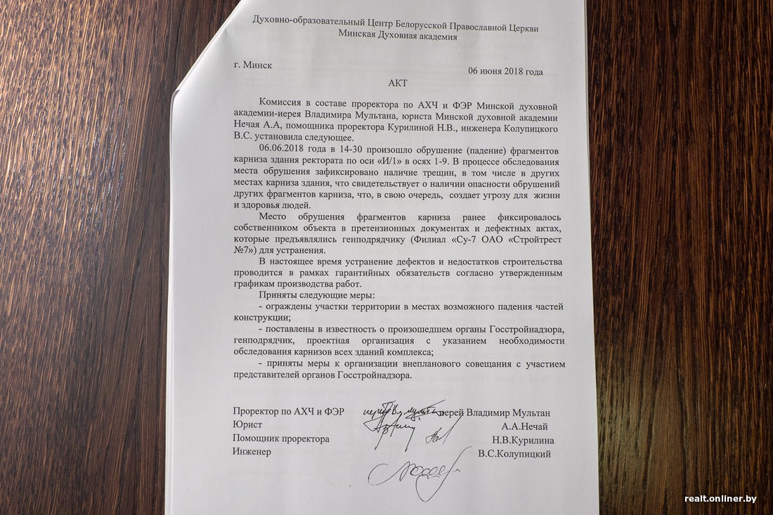 Отец Владимир держит в руках массивную глыбу — фрагмент бетонного карниза, который рухнул с трехэтажной высоты во внутренний двор Духовно-образовательного центра БПЦ в Верхнем городе. За все время здание «отбросило» не один метр такого карниза, покрылось трещинами и грибком. В некоторых помещениях общежития, входящего в состав комплекса, прошлой зимой температура не поднималась выше 17 градусов, а в актовом зале невозможно было находиться без верхней одежды. Позолоченный купол за пару лет потускнел и облез. Священнослужители, которые отвечают за эксплуатацию здания, уверены, что оно не соответствует архитектурному проекту, а работа подрядчика по устранению дефектов носит скорее косметический характер. Реальные причины того, что в историческом центре города разрушается роскошный духовно-образовательный центр, построенный за церковные и бюджетные средства, остаются почти без внимания. Об историческом комплексе в центре города, возле которого опасно ходить, наш материал.