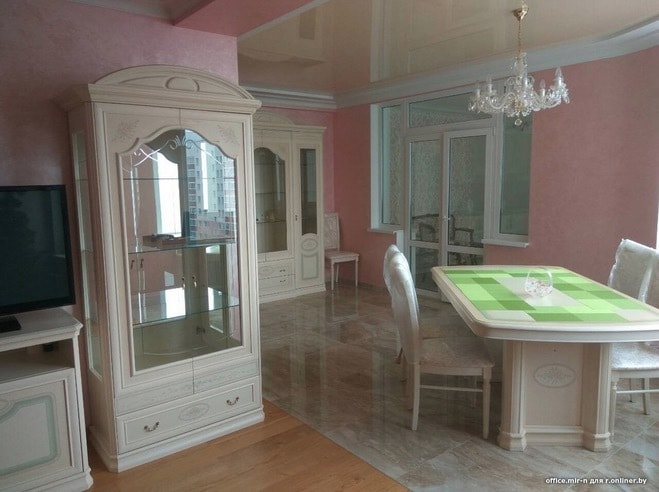 В прихожей — комбинированный шкаф с зеркалом для верхней одежды и обуви, мягкий пуф, телефон-трубка Panasonic, модем для интернета. В гостиной, совмещенной с кухней, — диван-трансформер (внутри спальное место) жемчужного цвета, производство Финляндия (2 шт.), стол журнальный из закаленного стекла, подставка под ЖК-телевизор из закаленного стекла, LCD- телевизор Supra STV-LC 32 (c встроенным DVD, HDMI, USB), кухня встроенная с мойкой, вытяжкой, набором французской посуды и столовыми приборами, микроволновая печь Samsung, электроплита Gefest 6140-1, электрочайник Mesko MS1217, холодильник двухкамерный „Атлант“ МХМ-2819-90, водонагреватель Lamborghini на 90 литров (производство Италия).