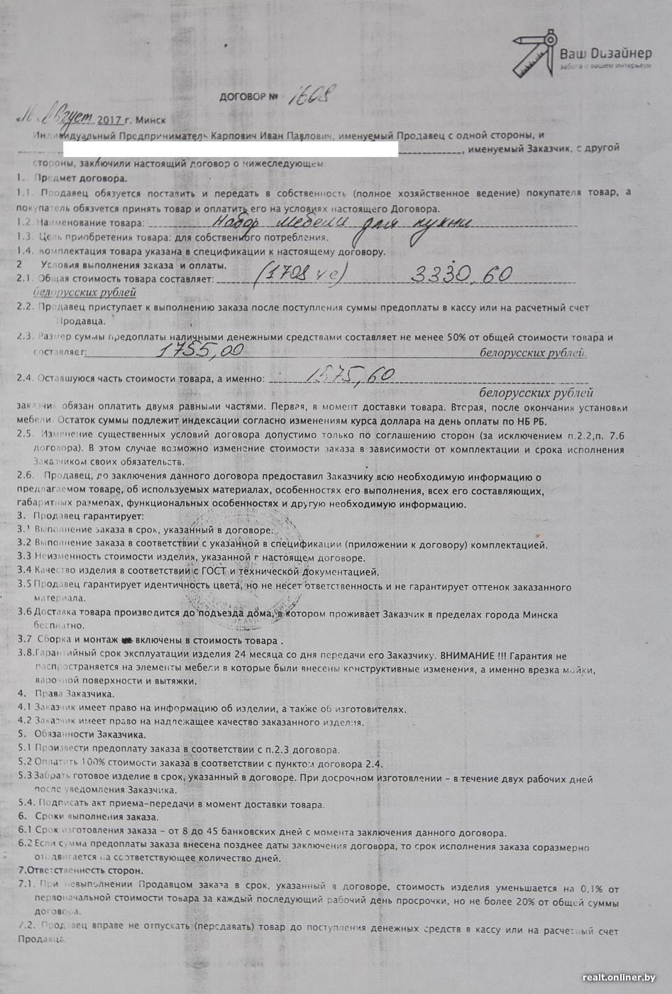 Галина обратилась к Карповичу 20 июля, заказала у него кухню на дачу. Сумма заказа составила $846, предоплата — $400. Хотя по договору срок поставки кухни должен был составить 10—15 рабочих дней, Карпович обещал сделать кухню до 19 августа, но даже в этот срок не уложился.
