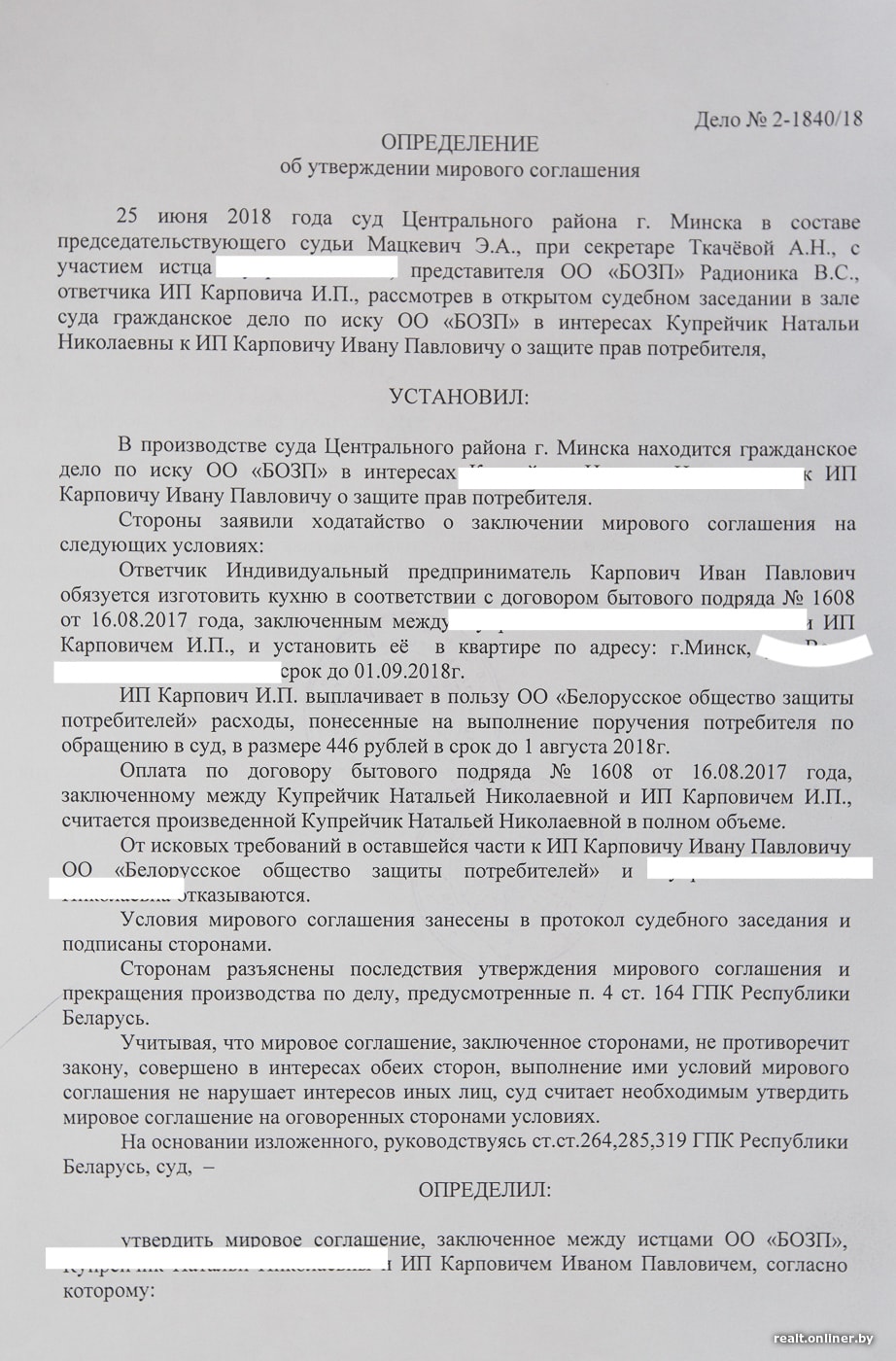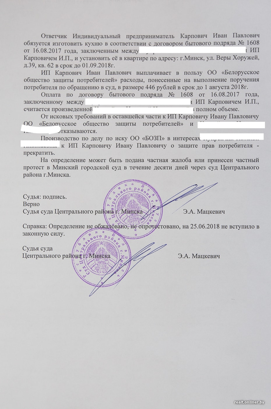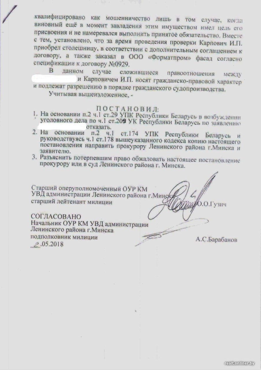 Повторное заявление приняли только от нас. Карповича вызывали на опрос, и он дал показания, что кухня доделана (а мы действительно доделали фасады за свой счет). Через неделю по почте нам пришло постановление, в котором первый лист был посторонний, а во втором было написано, что в возбуждении уголовного дела нам отказывают, потому что деньги мы потратили на приобретение алкоголя. Что это значит и о каких деньгах идет речь — до сих пор остается загадкой.