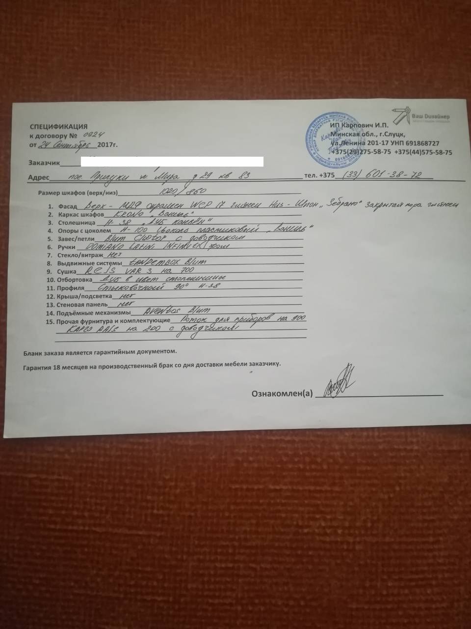 Еще $100 в счет оплаты заказа взял с меня сборщик кухни, который сотрудничал с Карповичем. У него сломался шуруповерт, и он сказал, что без инструмента не сможет собрать мою кухню до конца. Это тоже отмечено в договоре. Вот только вторую часть кухни Карпович мне так и не привез, поэтому собирать там нечего. Даже варочную панель я устанавливала за свой счет.