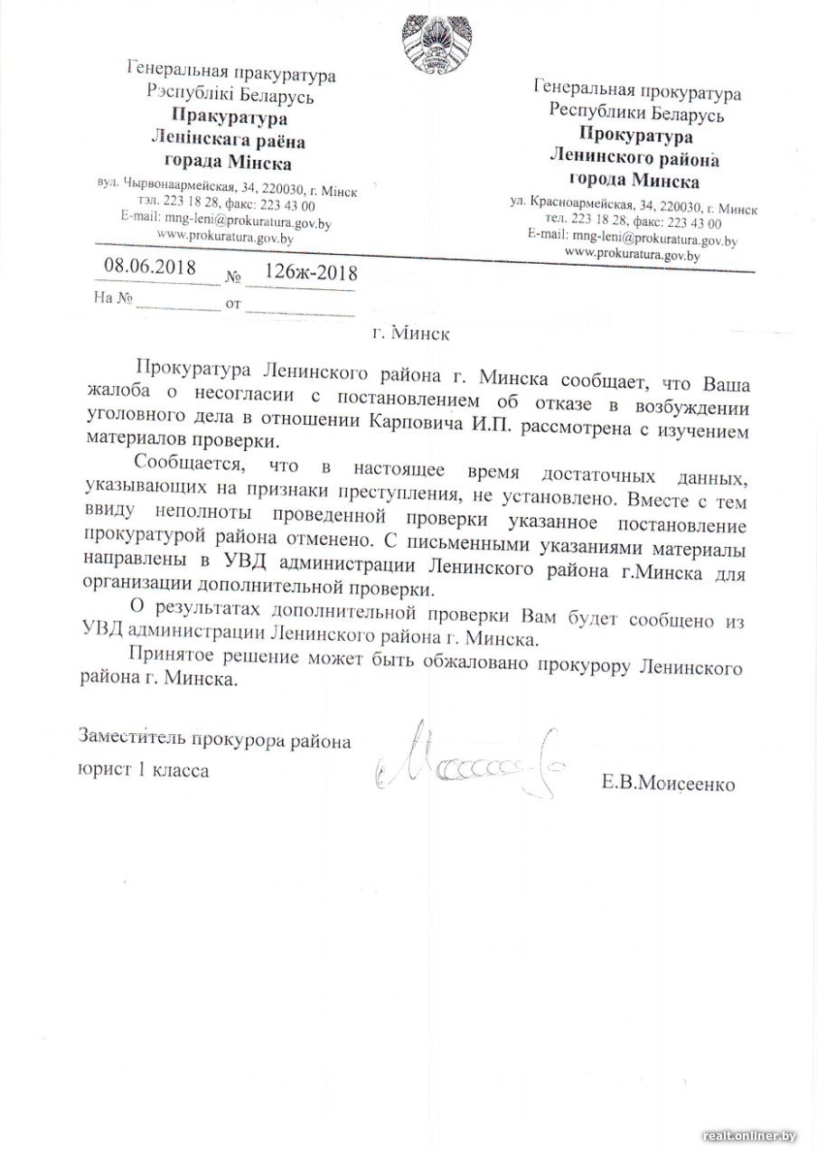 Татьяна Ковалева, официальный представитель Ленинского РУВД рассказала Onliner.by, что в отношении Ивана Карповича и законности его действий проводится проверка. В 2008 году Карпович был судим по ч. 3 ст. 209 (мошенничество, совершенное в крупном размере).