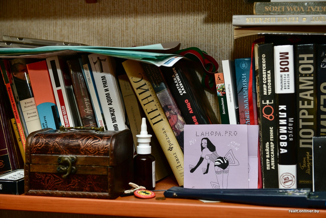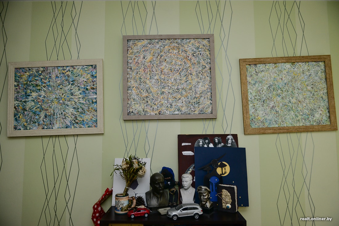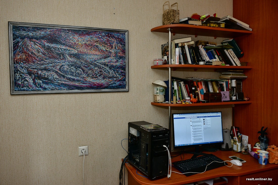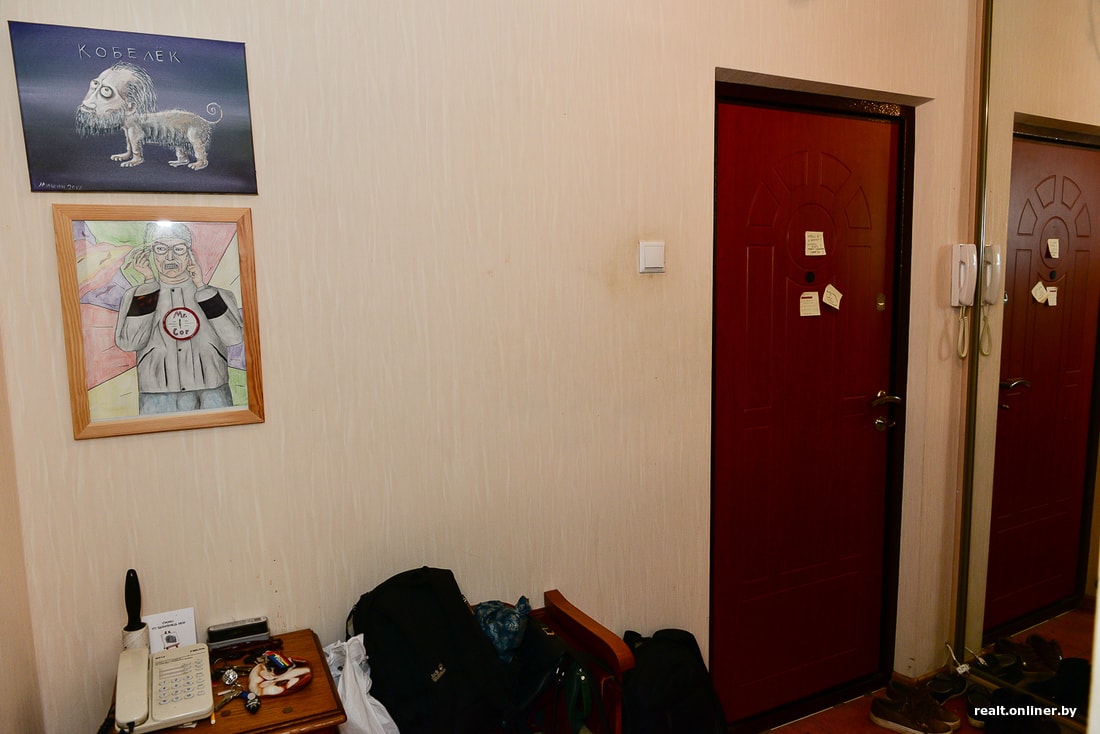 Эта двухкомнатная квартира расположена в одной из ярких панелек микрорайона «Зеленый Бор». Общая площадь — 57 «квадратов», две жилые комнаты (17 и 13 кв. м), кухня (9 метров), раздельный санузел, лоджия и длинный коридор. Много картин, книг (их стопки без пиетета сложены на полу), пластинок, дисков, бюстов вождей. Те артефакты, которые не поместились в квартире, перекочевали в тамбур: например, вымпел с портретом Че Гевары и мотивирующим лозунгом. На тренажере аккуратно сложены одеяла и пледы на случай зимы: кажется, жильцы не очень любят спорт. Об остальном вам предстоит догадаться самостоятельно.