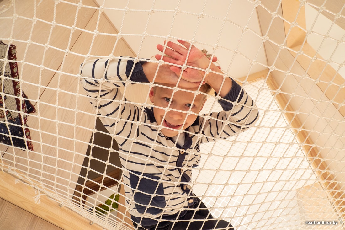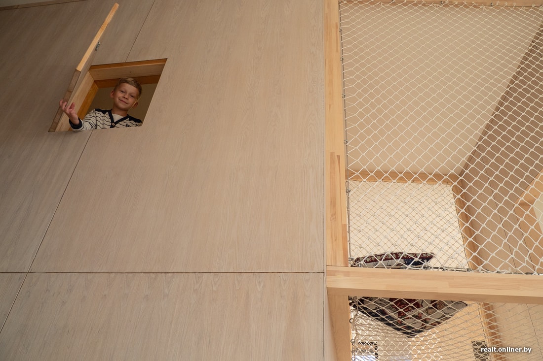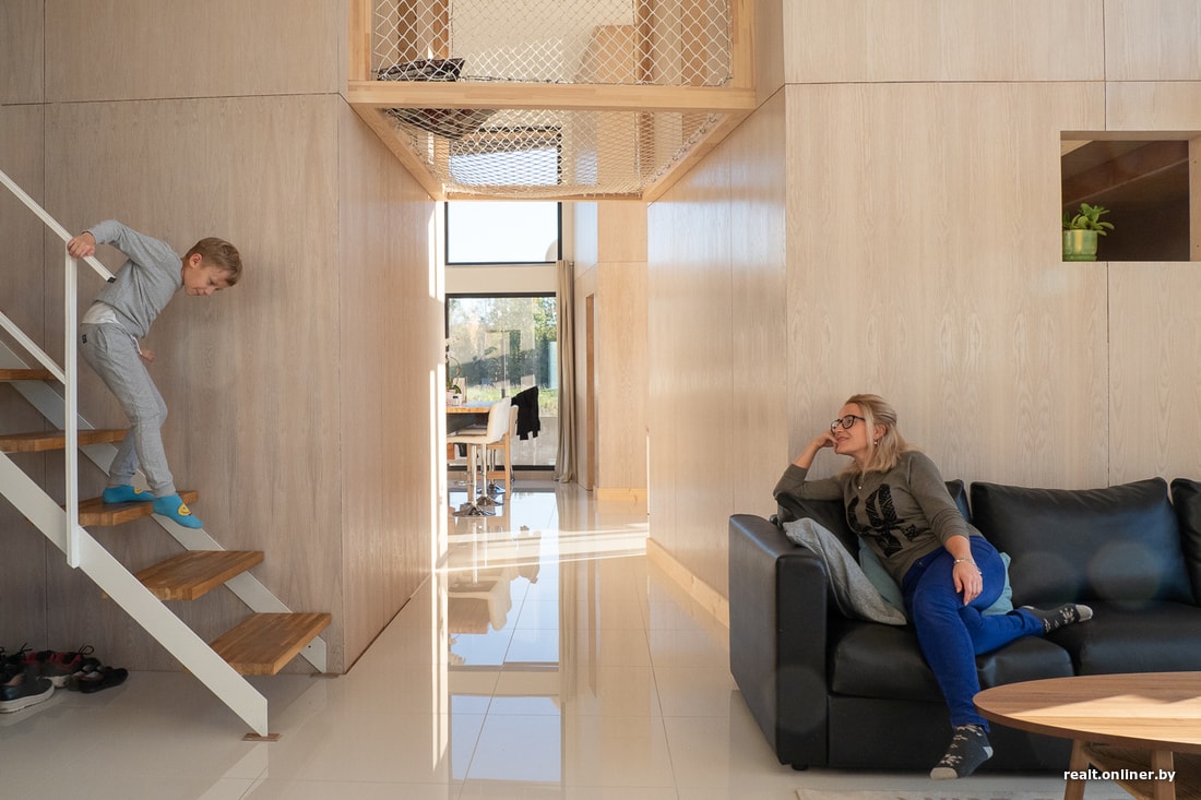 В других башнях расположены санузлы, родительская спальня, гостевая комната. У сына Захара две башни. В одной — спальня, в другой — игровая комната и своеобразный кабинет, где школьник будет делать уроки. Интересная деталь: перебежать из кабинета в спальню и обратно можно по натянутой на уровне второго этажа сетке. Это тоже фишка из японского проекта, в точности скопированная Виктором.