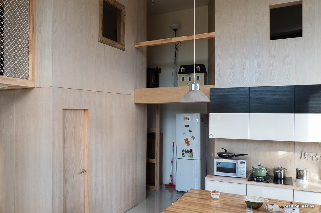 Вместе с братом Виктор построил компактный «каркасник» размером 4×4 метра, в стены заложили 200 миллиметров минваты, в пол — 300, в потолок — 450. Для всесезонного проживания этого оказалось вполне достаточно. За счет высокого потолка (почти 4 метра) здесь удалось организовать четыре уровня. В самом низу располагаются гостиная, кладовая и прачечная, чуть повыше — прихожая и санузел, где душевая зона совмещена с туалетом. Выше находится кухня, а на самом верхнем уровне — двуспальная кровать. С пользой задействован каждый сантиметр. К примеру, платформа на крыше санузла служит рабочей поверхностью и столом для компьютера.
