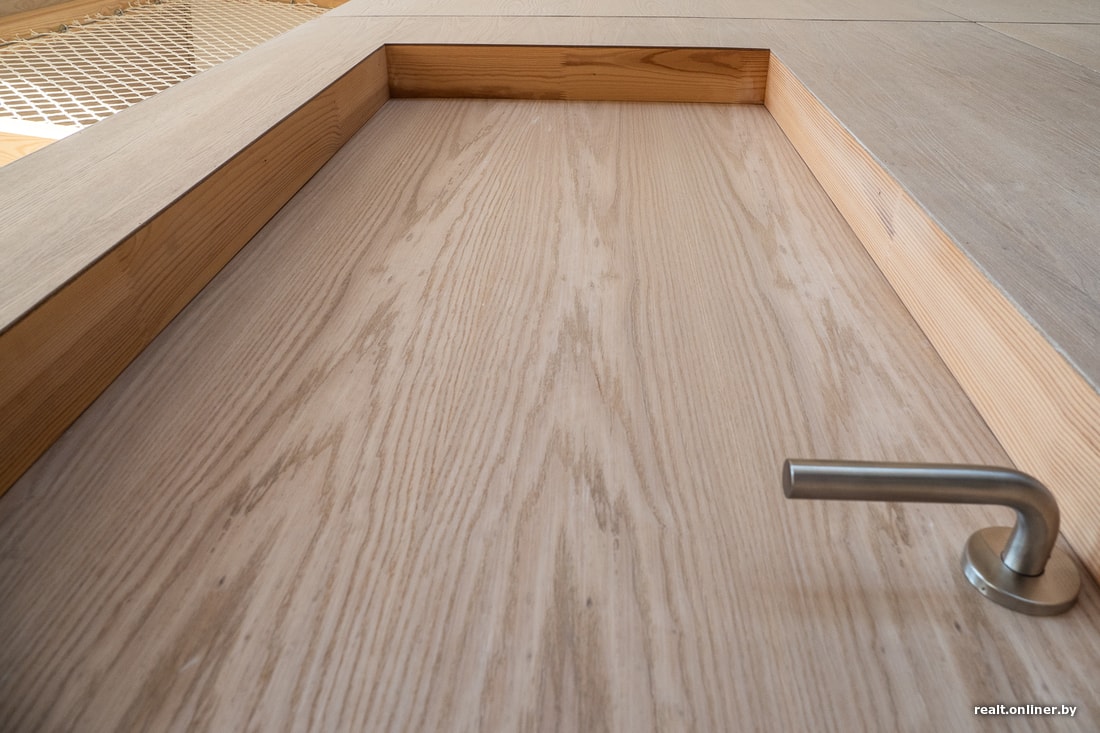 Как можно видеть по фото, ремонт еще не завершен: не хватает плинтуса, не затерты швы между листами шпона, где-то вообще нет отделки. Ни одна из комнат не приняла свой окончательный вид. Тем не менее Виктор показал нам каждое помещение и рассказал о его предназначении.
