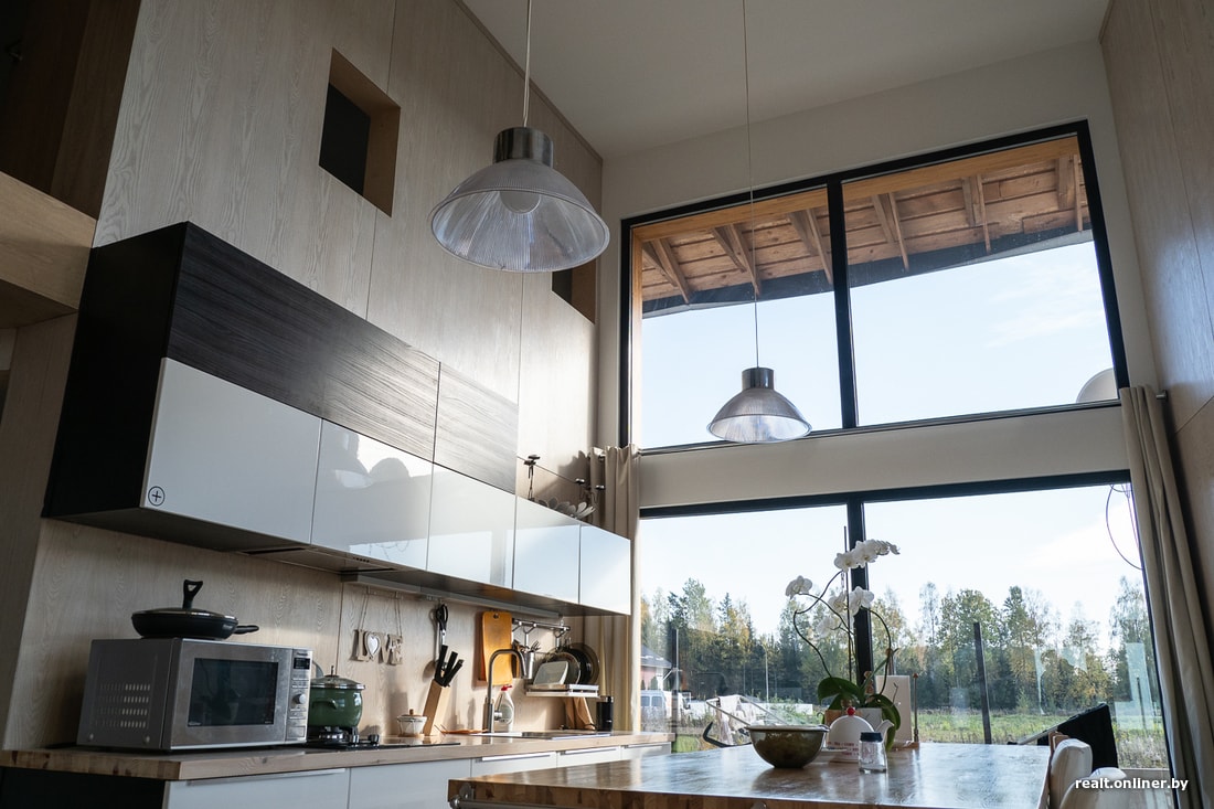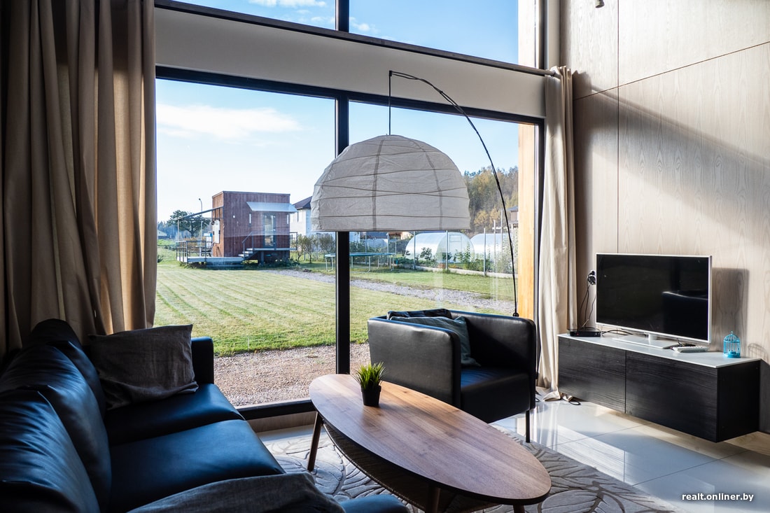 Потолки высотой 4,5 метра и окна в пол — это, конечно, космос. Сидишь на диване у телевизора — будто бы на залитой солнцем лужайке. Окружающий ландшафт становится частью интерьера, и любые перемены в погоде меняют атмосферу в помещении. С такими окнами уж точно не пропустишь чередование пор года.