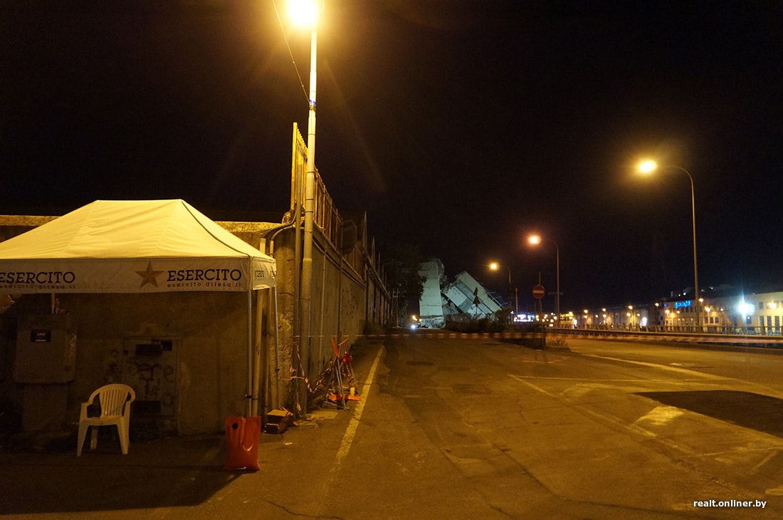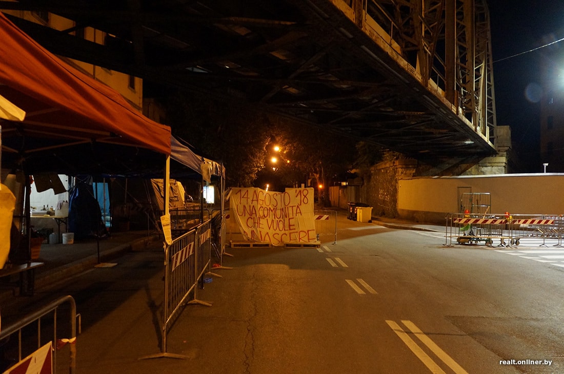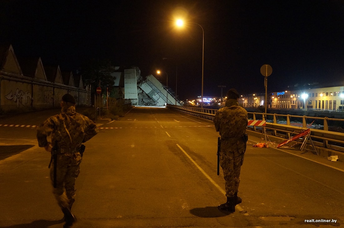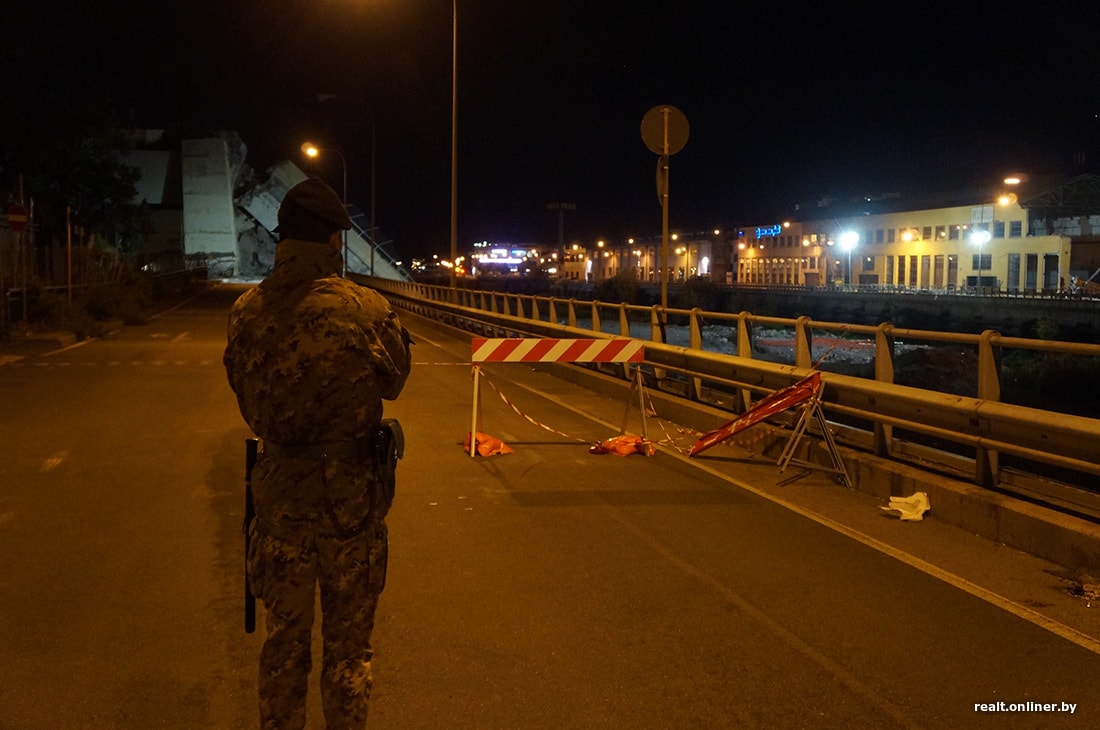 «Вам туда нельзя, — женщина в полицейской форме машет руками и пытается вспомнить хоть несколько слов на английском. — Никому нельзя. Там опасно». Как и любой человек в погонах, она категорична в своих запретах. Корреспондент Onliner.by специально приехал к обрушенному мосту в итальянской Генуе после заката: днем пробраться сюда невозможно. Офицер убеждает, что ночью — тем более. Рядом виднеются палатки волонтеров. Селина — одна из них. Она понимает, почему я здесь: оказывается, даже в Италии слышали о том, что в Беларуси треснул мост над Припятью. Селина соглашается провести меня через блок-посты полиции и военных: «Только напишите, чтобы такого не повторялось».