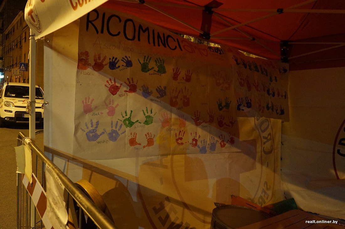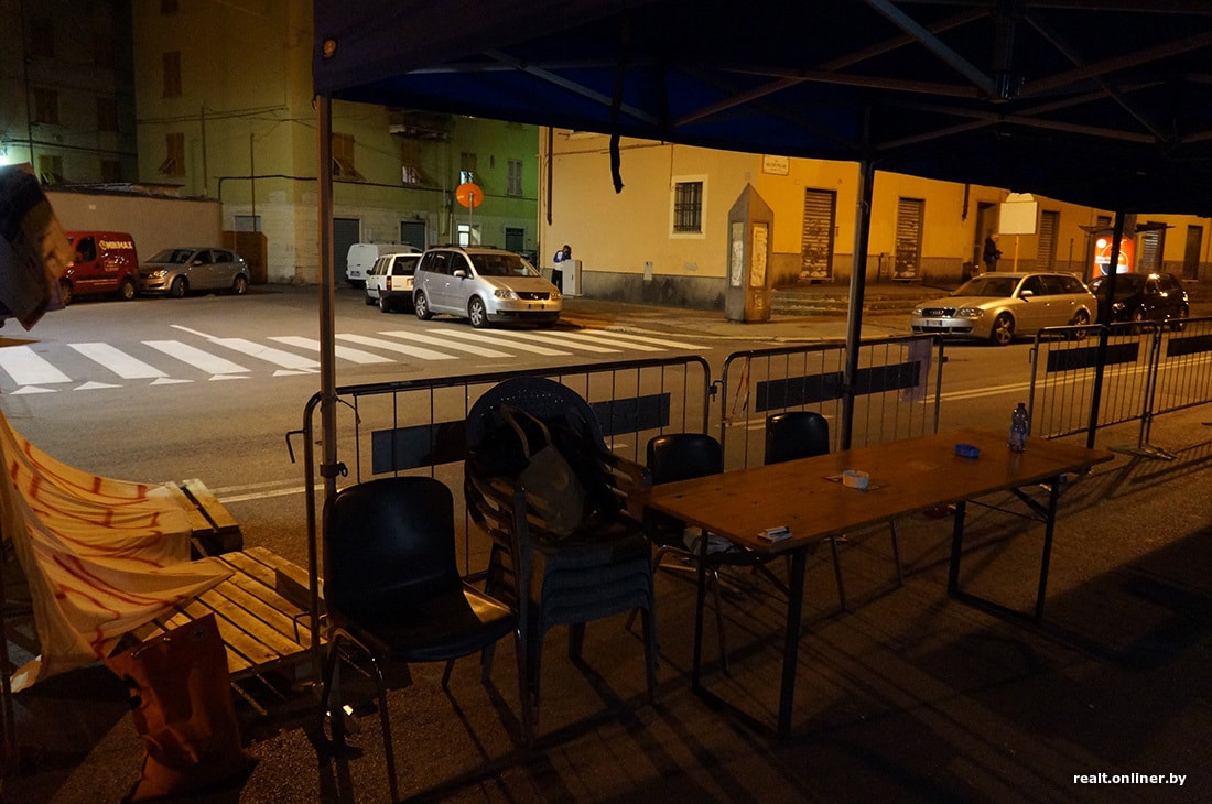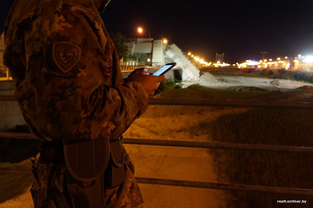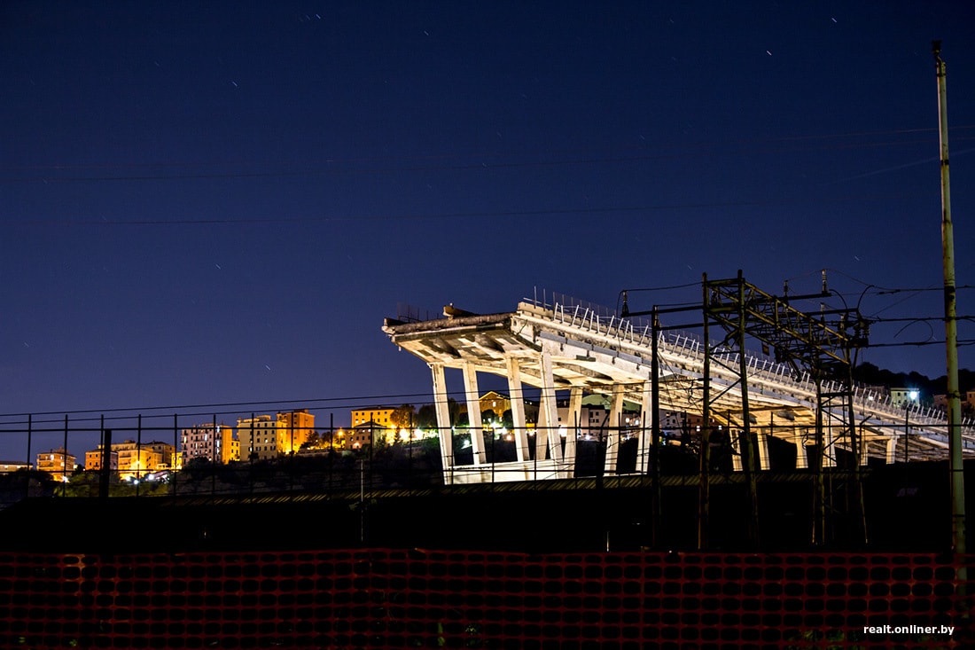 «Вам туда нельзя, — женщина в полицейской форме машет руками и пытается вспомнить хоть несколько слов на английском. — Никому нельзя. Там опасно». Как и любой человек в погонах, она категорична в своих запретах. Корреспондент Onliner.by специально приехал к обрушенному мосту в итальянской Генуе после заката: днем пробраться сюда невозможно. Офицер убеждает, что ночью — тем более. Рядом виднеются палатки волонтеров. Селина — одна из них. Она понимает, почему я здесь: оказывается, даже в Италии слышали о том, что в Беларуси треснул мост над Припятью. Селина соглашается провести меня через блок-посты полиции и военных: «Только напишите, чтобы такого не повторялось».