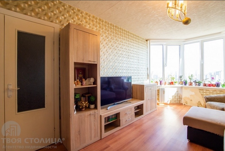 В «трешке» на улице Янки Мавра классическими, но очень контрастными обоями с принтом «дамаск» оклеили всю 14-метровую спальню. В рисунке нет ничего плохого, перебор есть в его количестве — если бы таким образом выделили всего одну стену, где расположено изголовье кровати, смотрелось бы намного лучше и спокойнее.