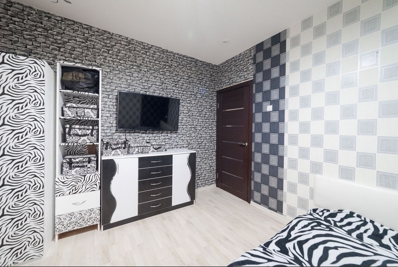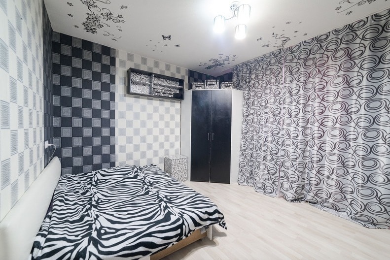 В этой комнате все черно-белое, что, в общем-то, не преступление. Но вот разнообразие форм и рисунков явно пошло во вред — с квадратиками, кирпичиками, овалами и полосками зебры явно случился перебор. 13-метровую спальню в квартире на улице Лидской хочется уравновесить, убрав несколько фактур.