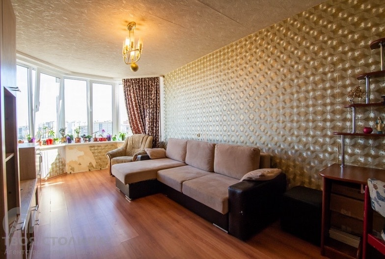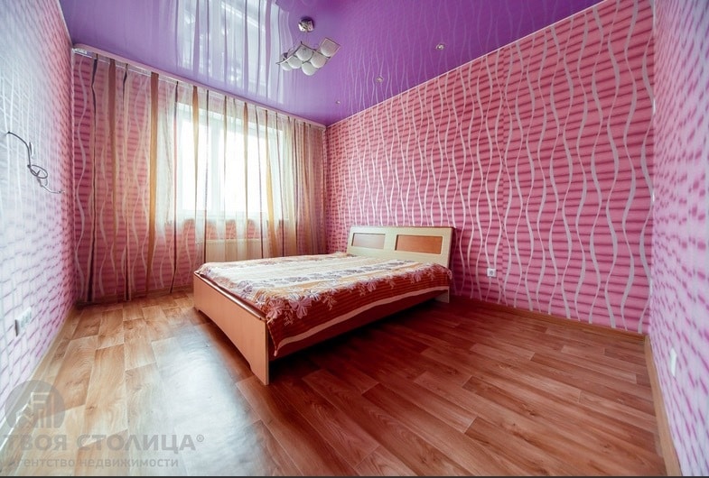 Одна из комнат в «двушке» на улице Янковского оклеена вызывающими красно-черными обоями. В тон им подобраны потолок и шторы. Диван с анималистичным принтом завершает картину. Судя по прикрепленной к объявлению планировке, в комнате 16 квадратных метров — не очень-то и тесно. Выручает жилье еще и то, что квартира «смотрит» на солнечную сторону, иначе было бы совсем мрачно.