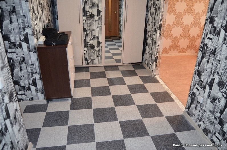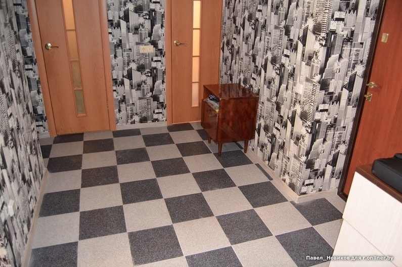 Еще немного обойной классики из квартиры на Матусевича: гостиная оклеена обоями с крупным цветочным принтом — все стены «захватили» переплетающиеся венки. Не менее ярко выглядит и коридор — черно-белые небоскребы повторяются очень уж часто. Вживую эти, как и все другие, обои выглядят наверняка лучше, чем на фото. Но пока голова начинает немного кружиться.