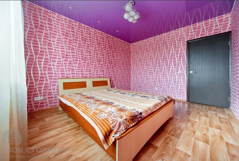 Царство «лиан», полосок и разных оттенков розового расположено в 12-метровой спальне в «двушке» на Матусевича. Сиреневый потолок делает комнату еще более яркой и запоминающейся. Too much.