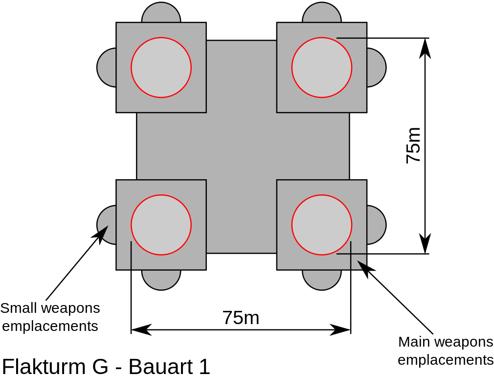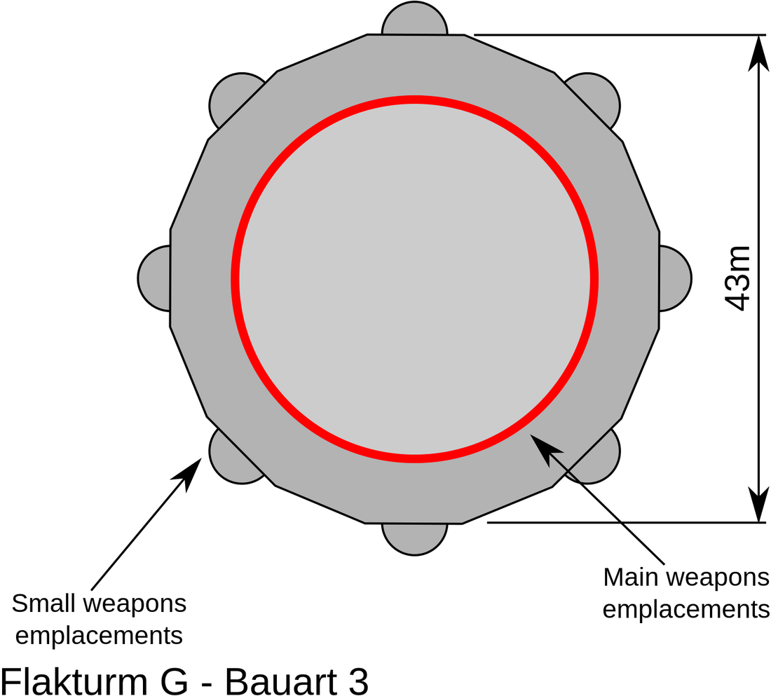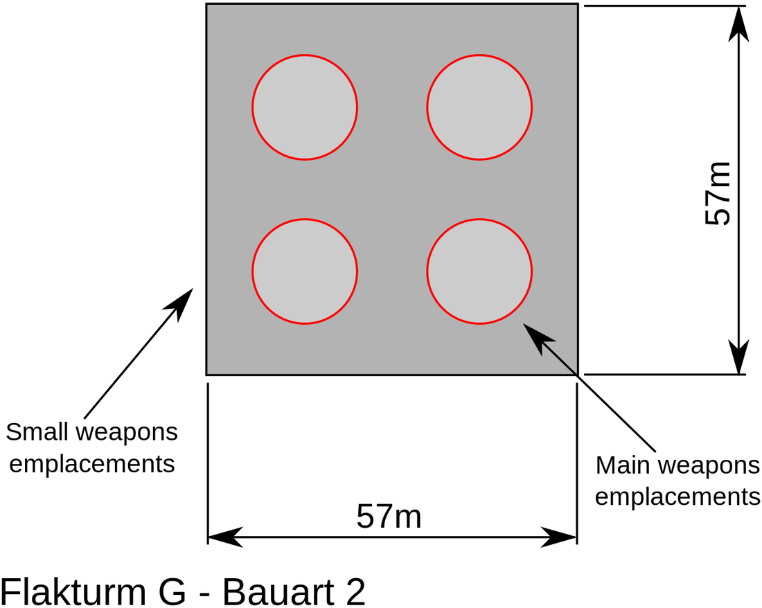 Каждый из зенитных комплексов представлял собой два расположенных рядом, на удалении в 300—500 метров друг от друга, сооружения из монолитного железобетона: боевая башня (G-Turm) и башня управления (L-Turm). Квадратная боевая башня высотой в 39 метров и со стороной 75 метров представляла собой, по сути, Hochbunker — наземный бункер с толщиной стен в 2—2,5 метра и крыши в 3,5 метра. Это был не просто доведенный до абсолюта пост ПВО, а целый многофункциональный комплекс. На шести его этажах располагались укрытия для гражданских лиц (на 8 тыс. человек, хотя по факту туда набивалось гораздо больше жителей города), госпиталь с операционными, помещения для хранения музейных ценностей и размещения гарнизона, склады для боеприпасов. Все это было оборудовано автономными системами водо- и энергоснабжения, комплектовалось подъемниками для снарядов и лифтами. На крыше (боевой платформе) размещались четыре 105-миллиметровые зенитные пушки (впоследствии их заменили на 128-миллиметровые версии), а вдоль пятого (верхнего) этажа находилась нижняя боевая платформа, где располагались 20-миллиметровые зенитки, предназначенные для ближней обороны башни.