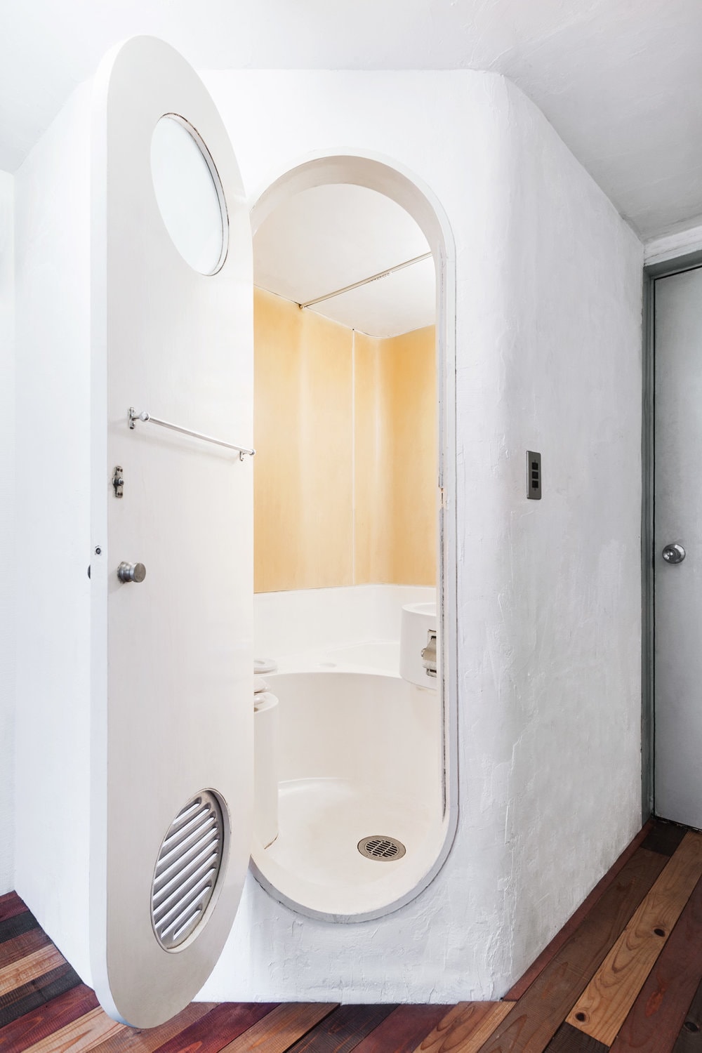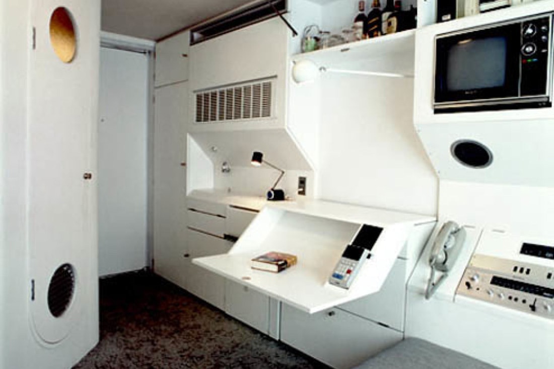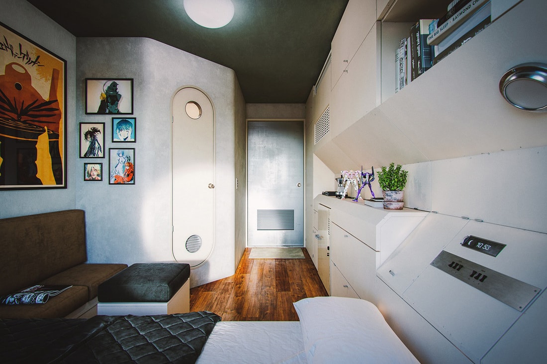 Модули при этом были меблированы и укомплектованы бытовой техникой уже на предприятии-изготовителе. Курокава смог оптимальным образом организовать внутреннее пространство, в котором нашлось место не только для кровати, рабочей зоны и шкафов, но и для санузла, размерами напоминавшего туалет самолета, но оборудованного даже ванной. Для связи с внешним миром было предусмотрено окно-иллюминатор диаметром 1,3 метра.