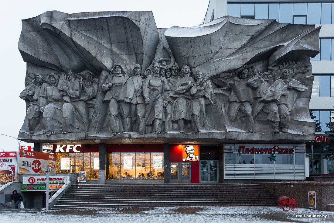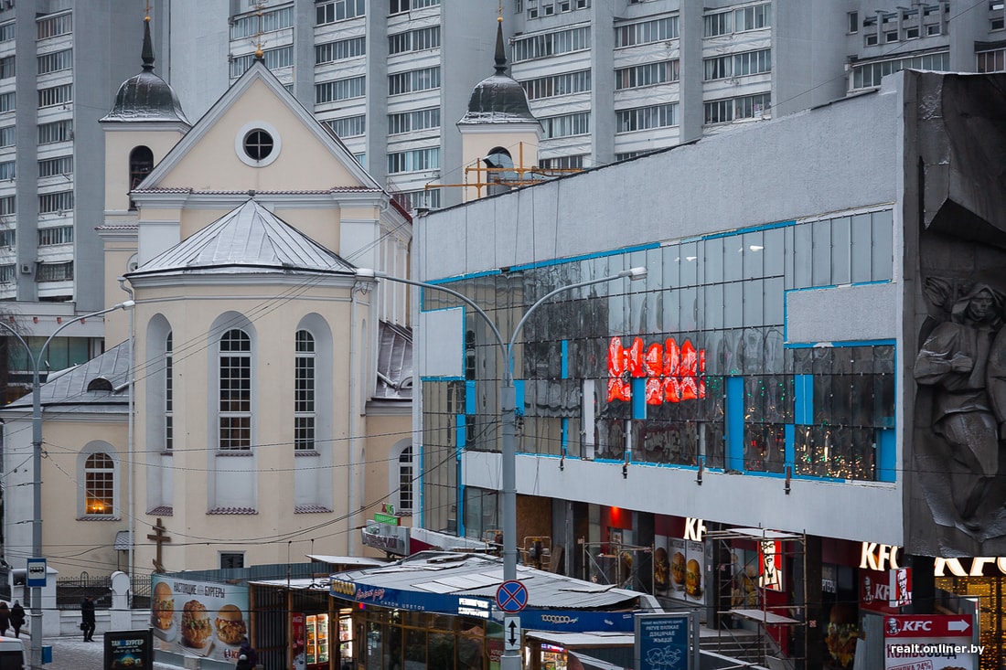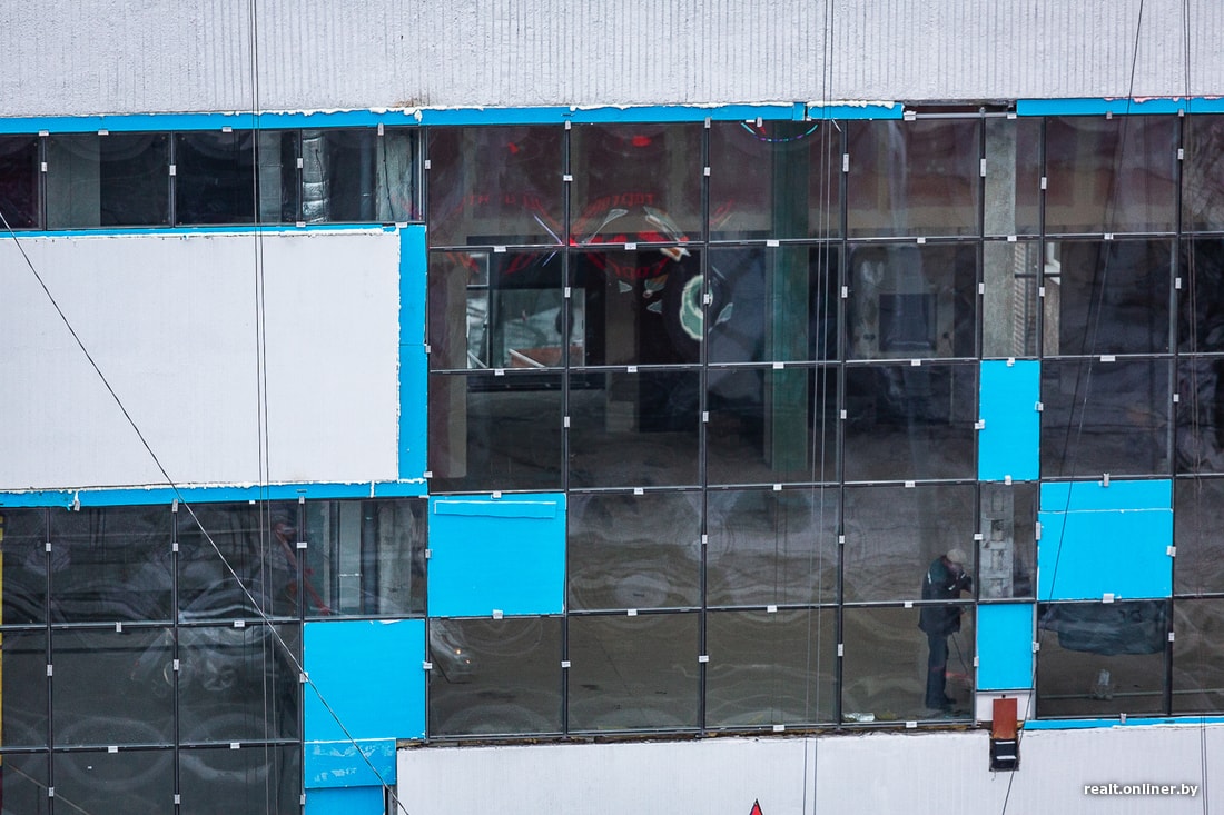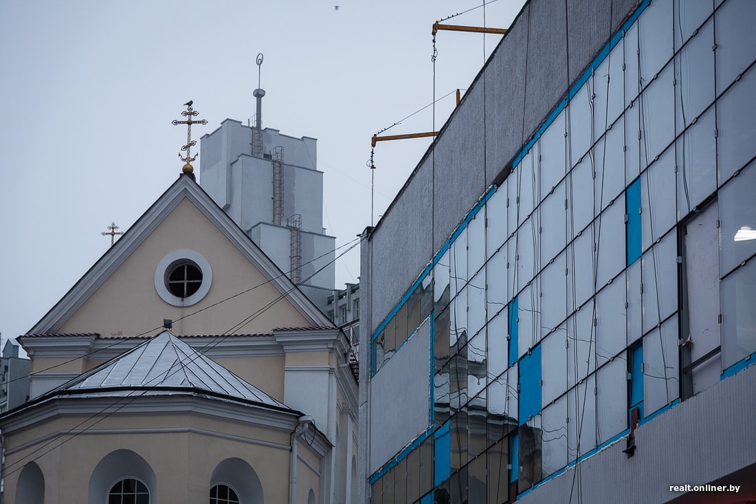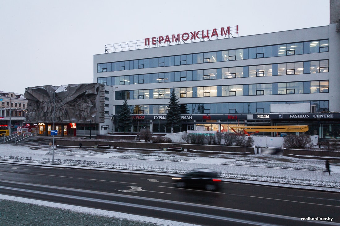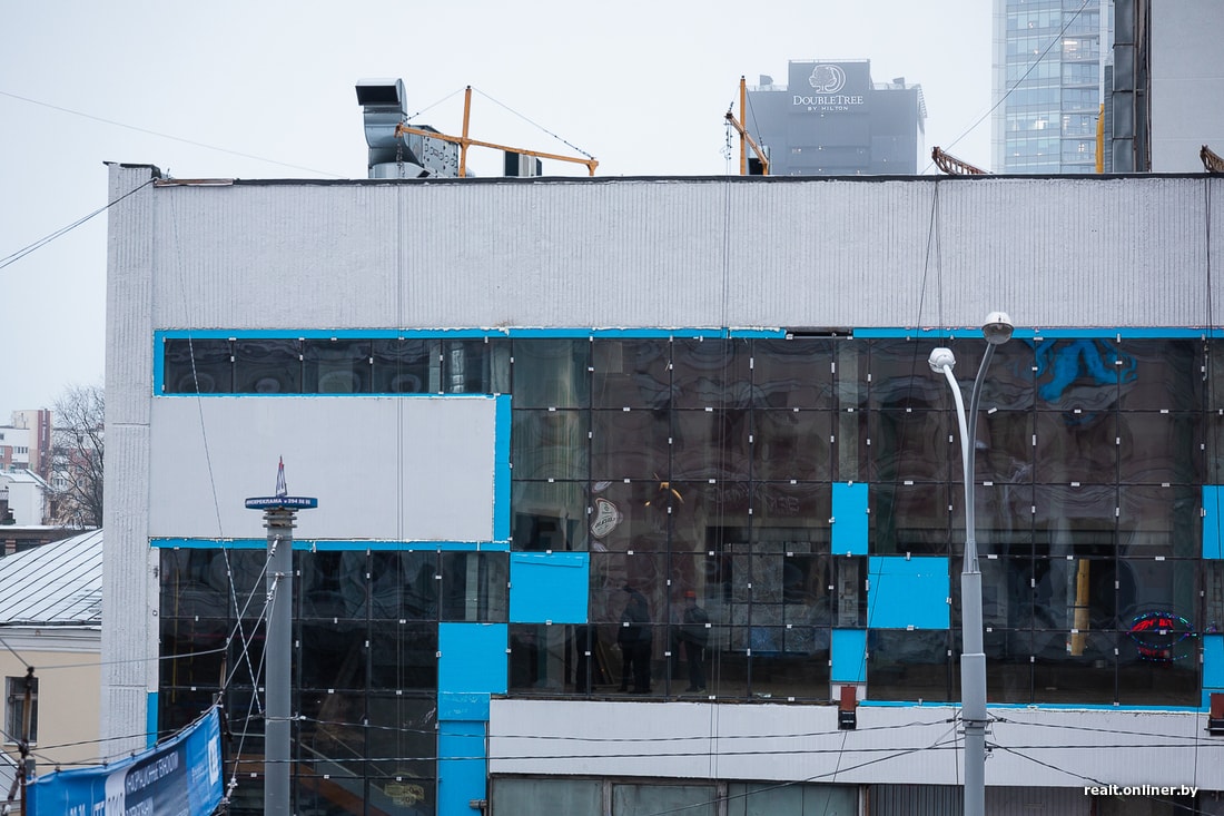 Центр моды на проспекте Победителей давно напрашивался на реконструкцию — расположенное в сердце города здание до того отдавало неблагородной стариной, что смотреть в его сторону (за исключением барельефа «Солидарность») не хотелось. О том, что с постройкой будут что-то делать, говорилось еще с 2014 года. Но действительно заметные всем горожанам изменения начали происходить не так давно. В частности, «кофейная» рекламная растяжка, долгие годы скрывавшая под собой фасад, смотрящий на улицу Немигу, уступила место современному остеклению. Прямо сейчас рабочие монтируют многочисленные зеркальные «соты», которым уже в следующем году предстоит стать «лицом» нового заведения.