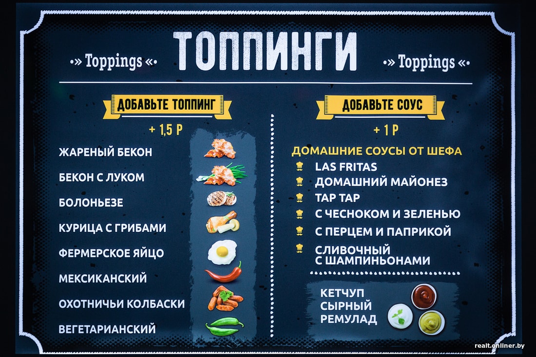 Дело в том, что в Испании есть специальные сорта картошки, которые подходят для готовки во фритюре, а у нас таких нет. Поэтому нам пришлось разработать полноценную технологию, которая позволила бы готовить свежий белорусский картофель. Для меня это было принципиальным моментом. Не скажу, что мы сделали полезный фастфуд, но он определенно не такой вредный, как в большинстве заведений. Мы все делаем на месте: от топинга и соусов до основных блюд, — рассказывает учредитель заведения Роман.