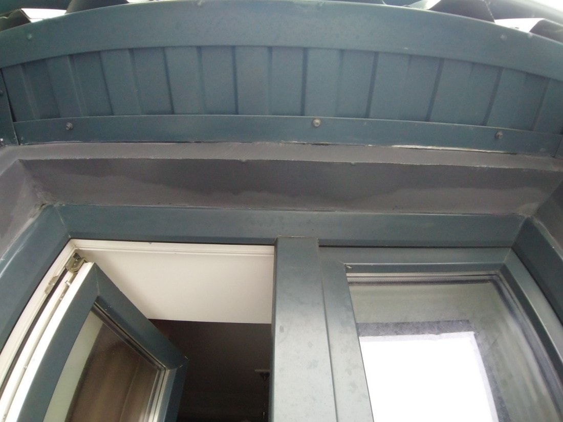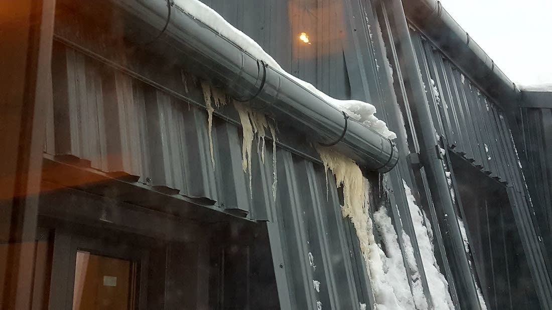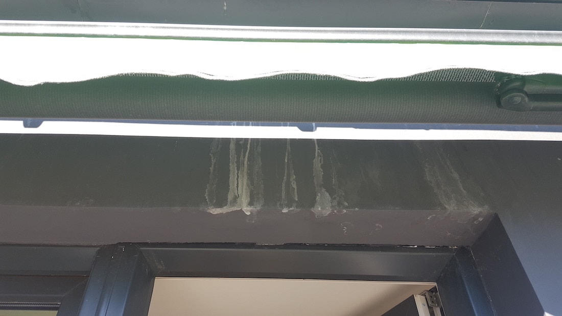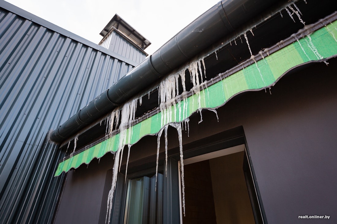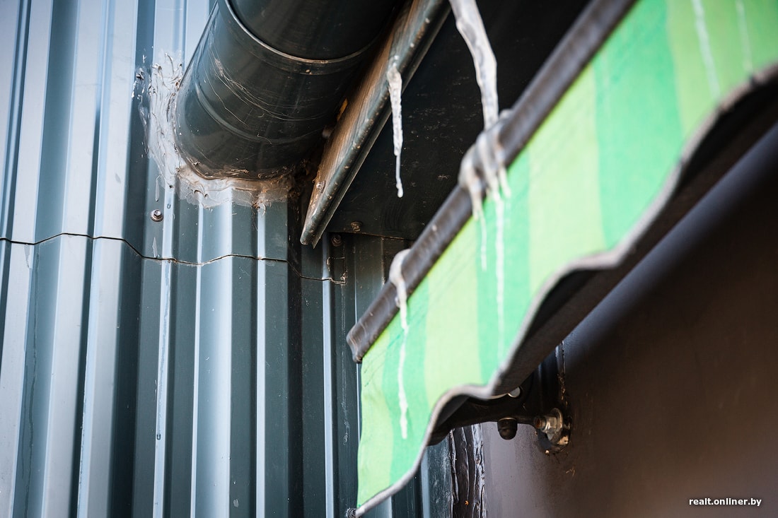 Как мы понимаем, во время строительства была нарушена технология производства работ, и конденсат, вместо того чтобы стекать в сливной желоб, собирается под ним. Соседи из других домов на что-то подобное вроде не жаловались, но наша беда — вот она, видна с улицы. Проблеме третий год, а продвижения в решении даже не предвидится.