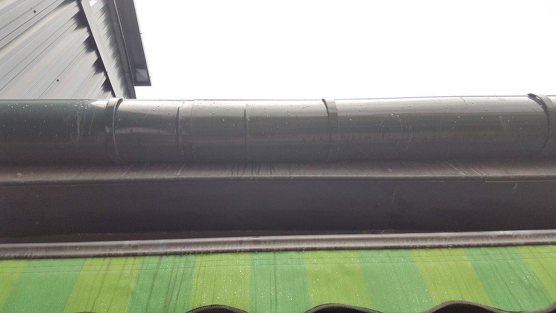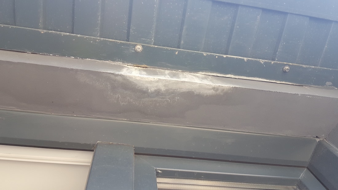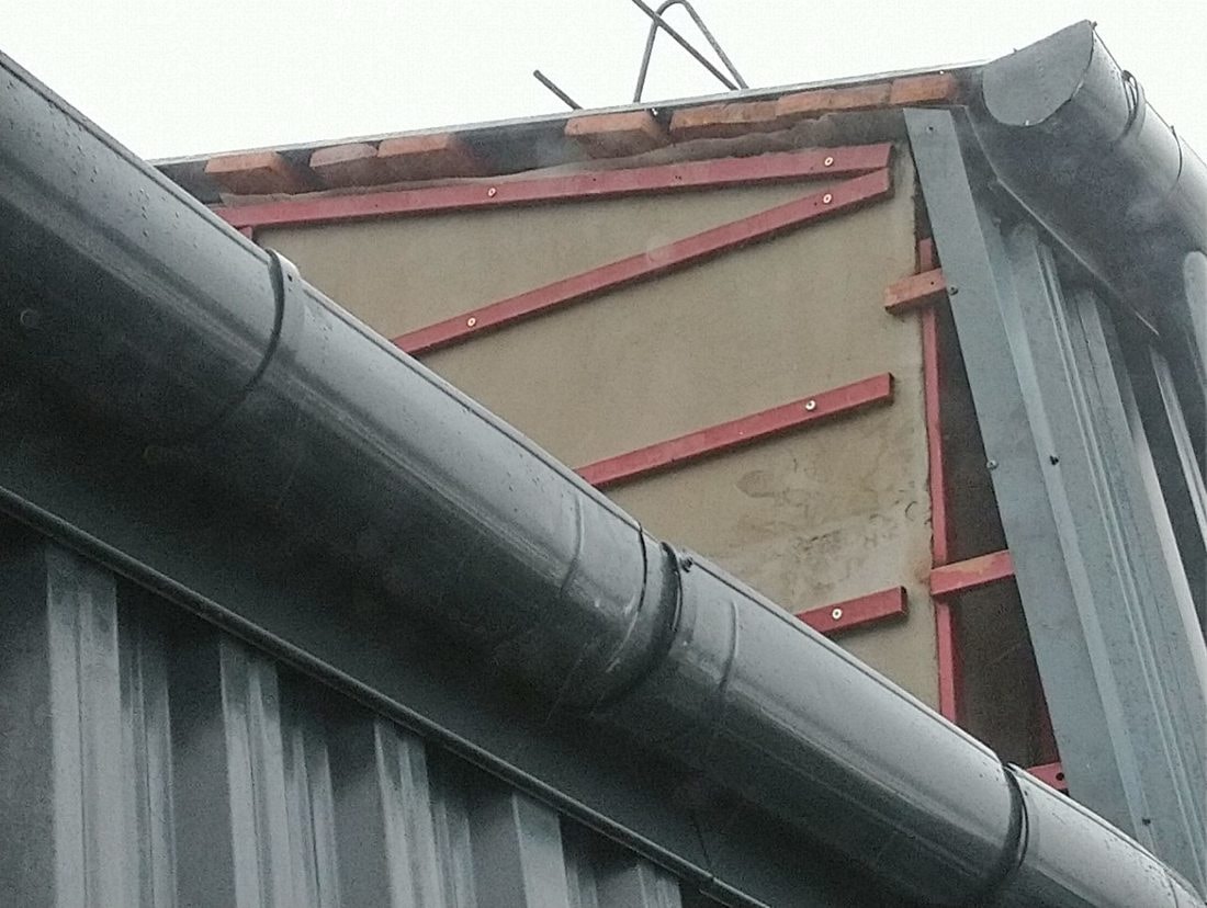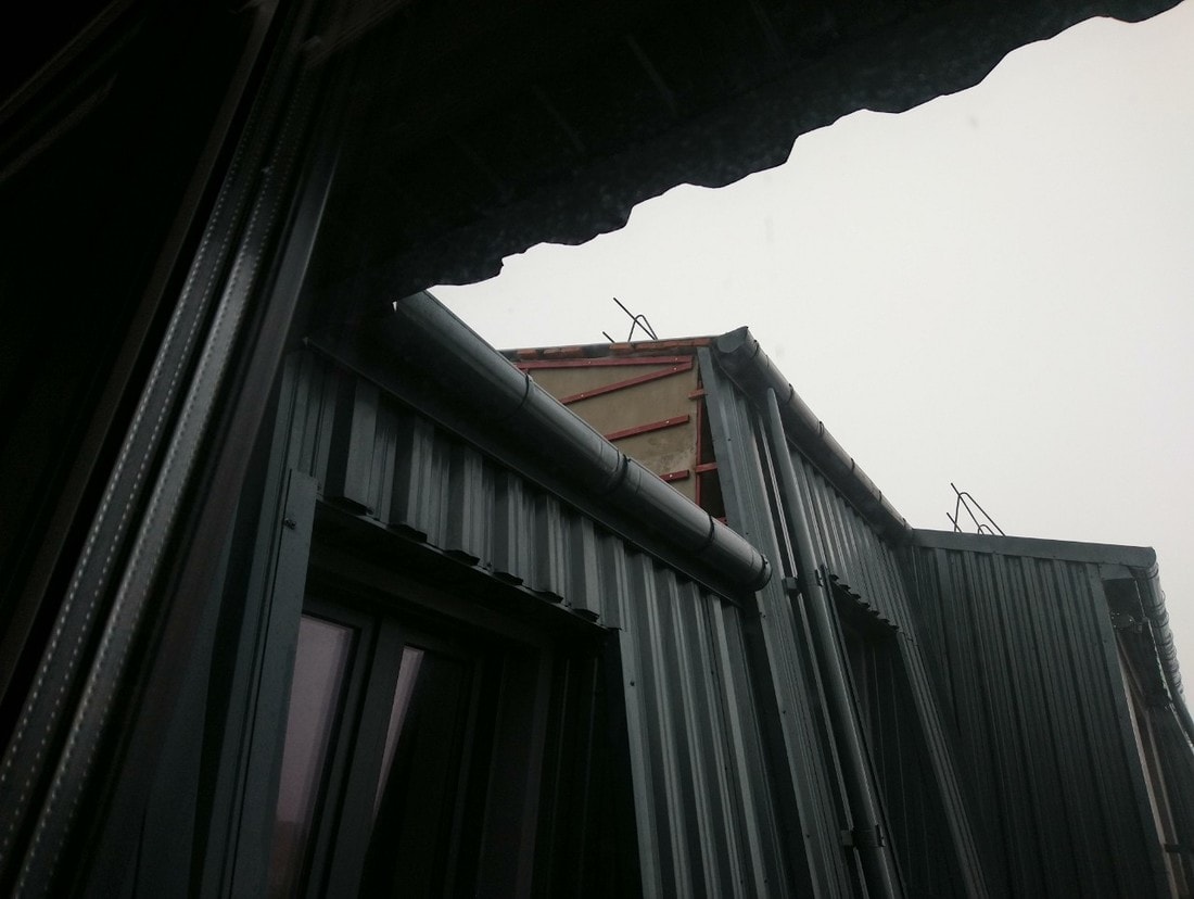 Как мы понимаем, во время строительства была нарушена технология производства работ, и конденсат, вместо того чтобы стекать в сливной желоб, собирается под ним. Соседи из других домов на что-то подобное вроде не жаловались, но наша беда — вот она, видна с улицы. Проблеме третий год, а продвижения в решении даже не предвидится.