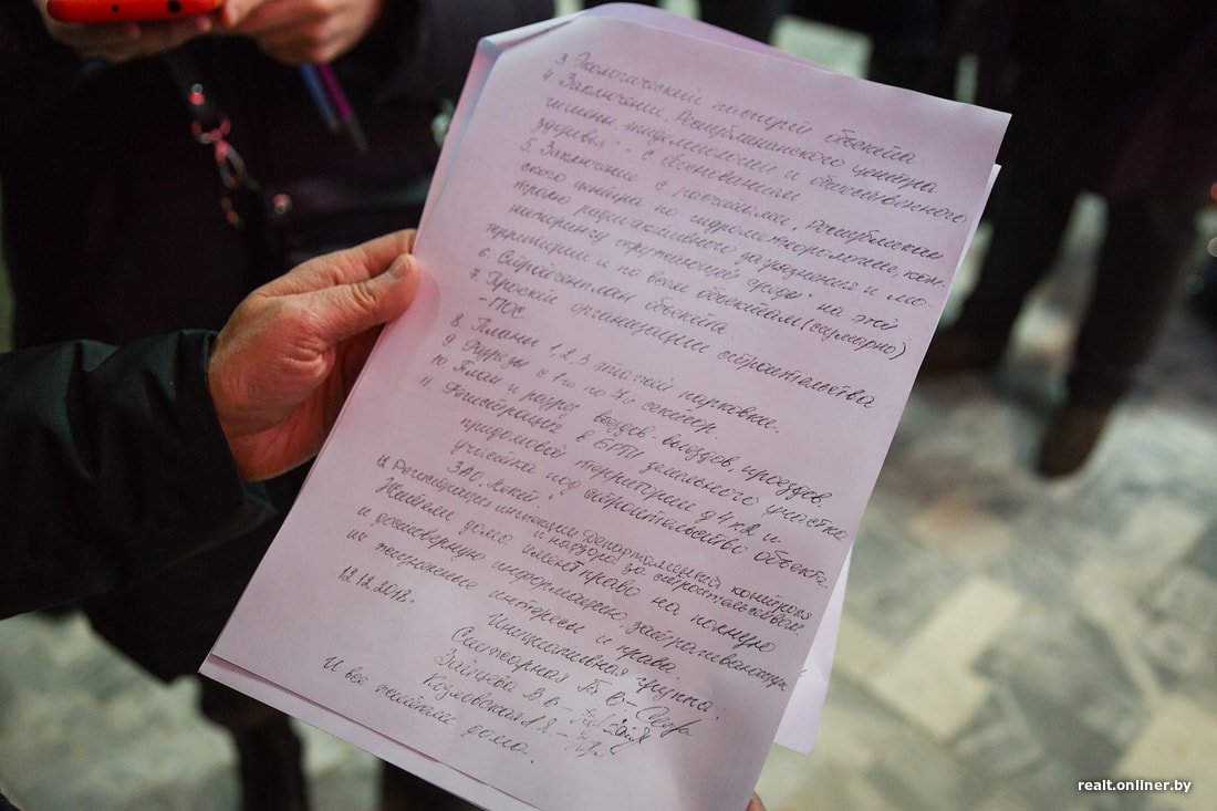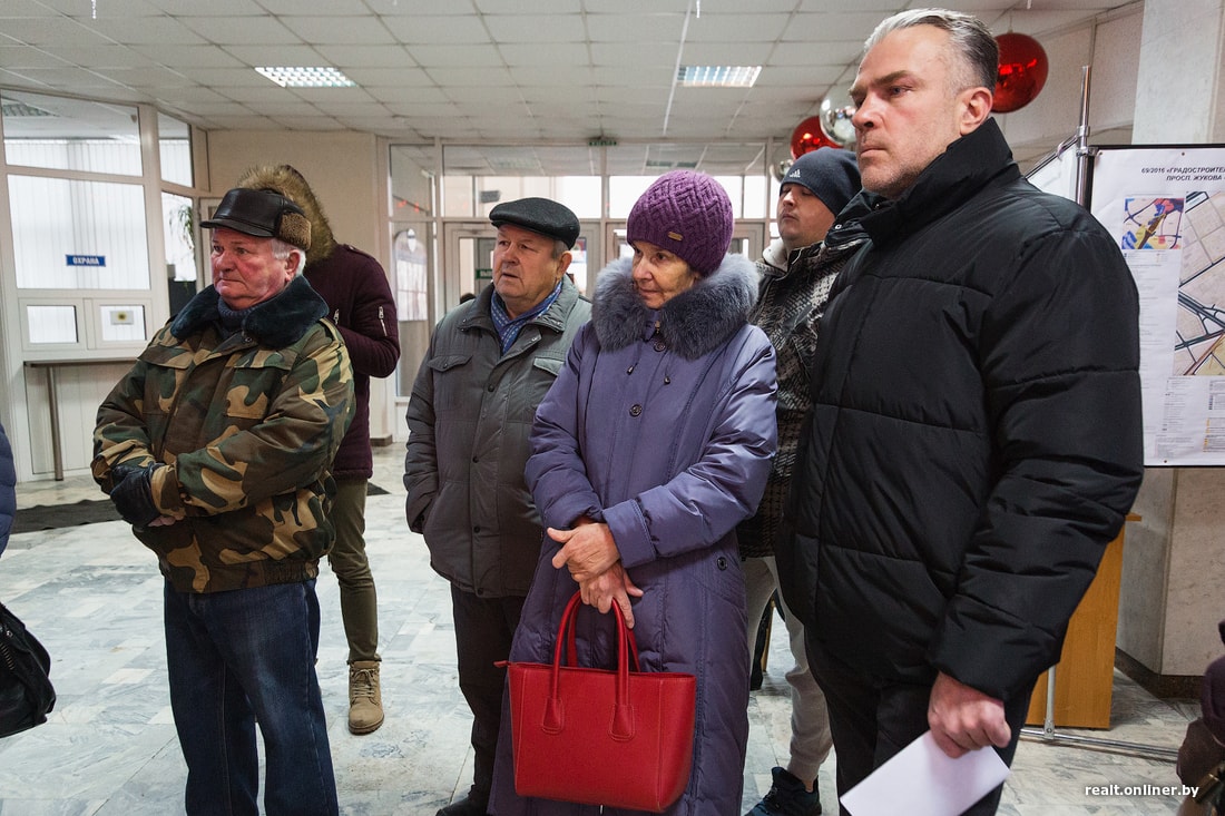 Глава исполкома Андрей Жайлович собрал людей в зале, где, увы, не было представителей застройщика и проектировщиков. Хотя расширенную встречу и можно было бы устроить — глава сам проговорился, что представители компании «Лект» ушли буквально за двадцать минут до появления людей.