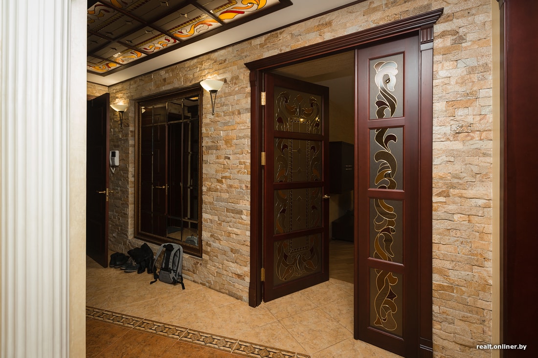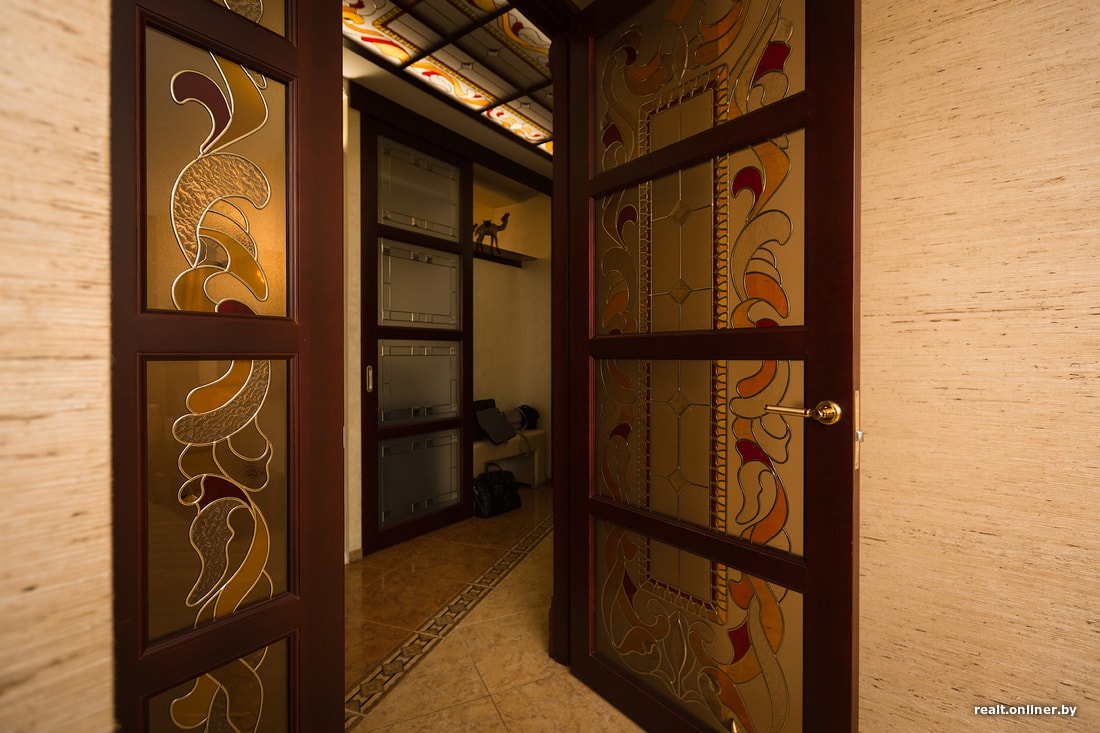 На полу в жилых комнатах — штучный паркет (дуб, красное дерево, клен), на стенах — венецианская штукатурка, в санузлах, на кухне и в прихожей — испанская и польская плитка. В одной из комнат стены оклеены обоями из морских водорослей. Двери — из массива, с остеклением витражами ручной работы. Квартира оснащена видеодомофоном, сигнализацией, в санузлах и на кухне имеется приточно-вытяжная вентиляция. Из бытовой техники — кондиционеры, стиральная и посудомоечная машины, бойлер, три телевизора, электрокамин.