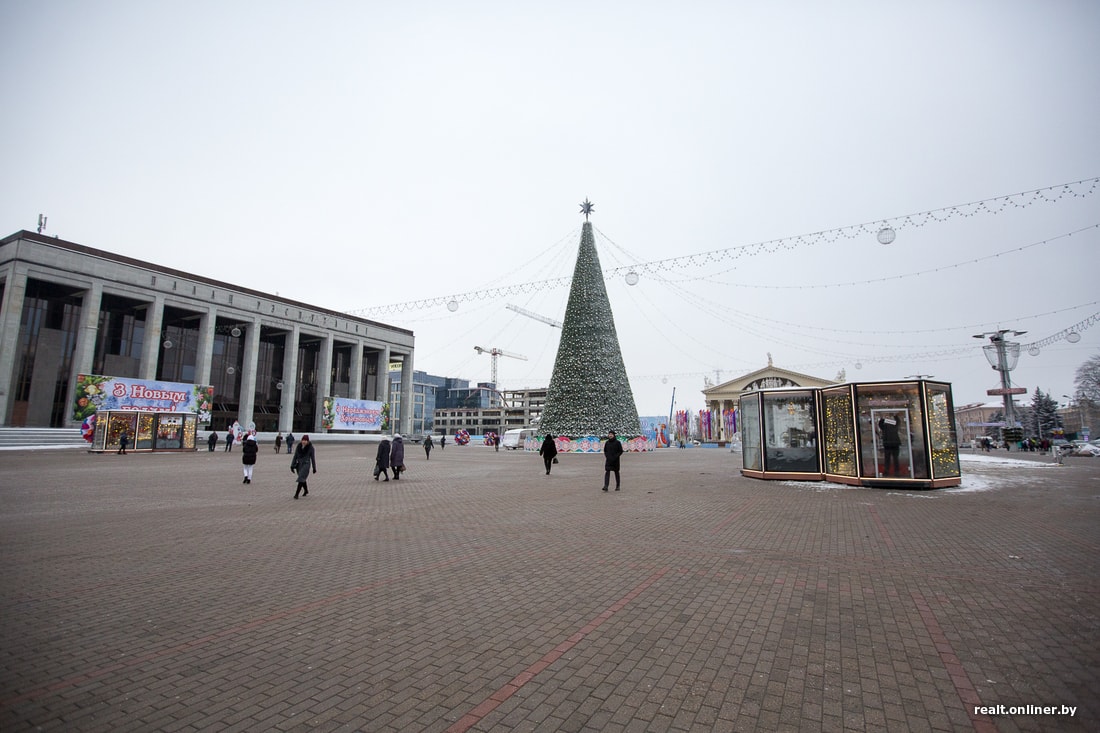Большая Октябрьская площадь вот уже несколько лет грустит без традиционного катка. На такой территории что ни поставь, все будет выглядеть одиноко и пустынно. Ситуацию не спасла даже елка (кстати, искусственная).