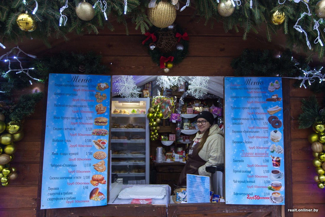 Внутри домиков теплее, но продавцы все равно подмерзают. Точка под названием «Волки сыты» работает уже второй год. Глинтвейн здесь стоит от 4,5 до 6,5, пунш — от 3,5 до 5 рублей, какао — 3 рубля, картошка фри — 4,5, хот-дог — 4,5.