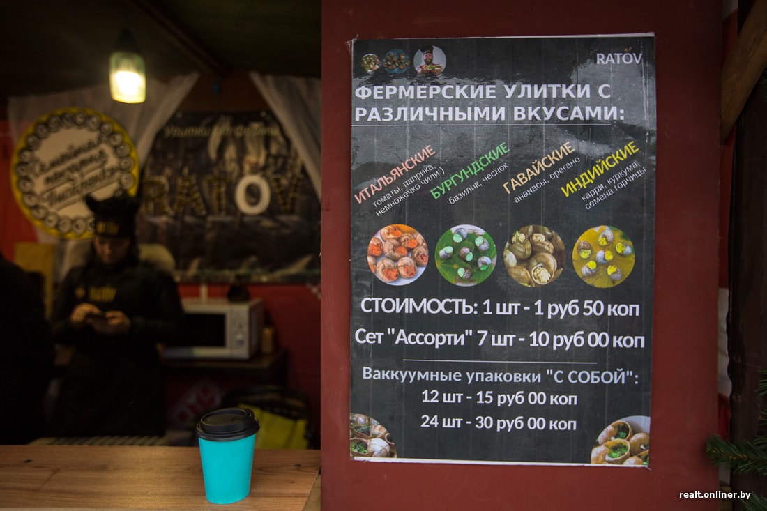 Из оригинального: к существующей одной точке с улитками добавилась вторая. Готовят их супруги Владимир и Виктория, которые представляют собственную ферму «Ратов». Упаковка с 12 штуками стоит 15 рублей, с 24 штуками — 30 рублей. Сет из семи улиток с багетом обойдется в 10 рублей. Можно взять и поштучно. Здесь же есть пироги от семейной пекарни Писаренко.