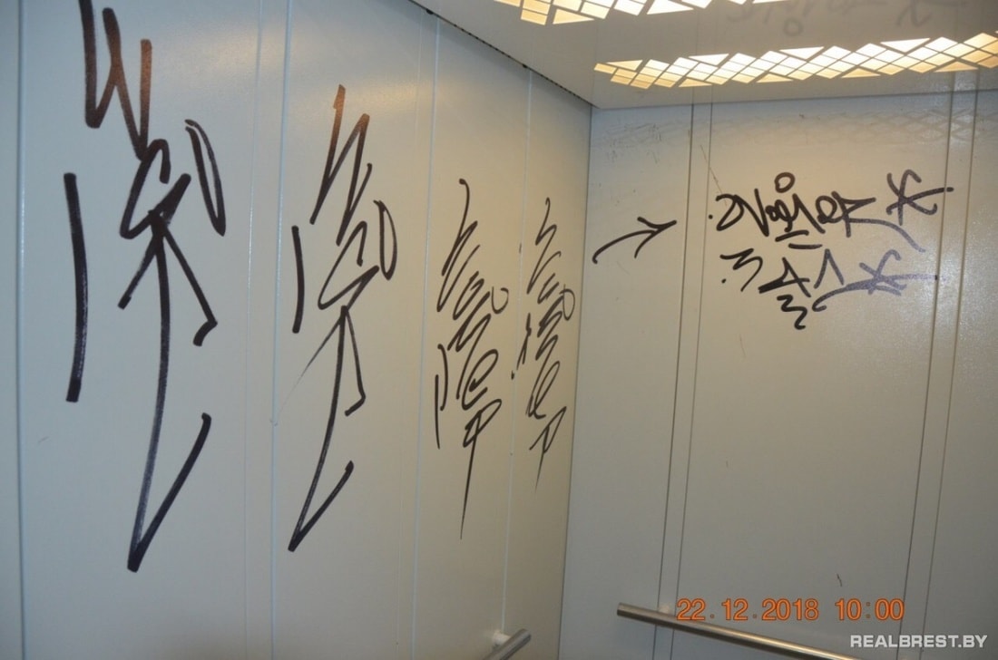 В ночь на 22 декабря акционисты разрисовали маркером стены внутри лифта, а также двери на одном из этажей.