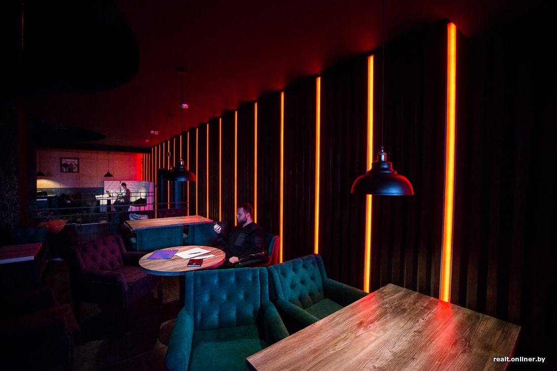 — Самое главное в планировке — два этажа и сцена. Есть большой бар, который, возможно, нельзя назвать необычным, но в совокупности со сценой, расположенной над ним, он получается весьма интересным.